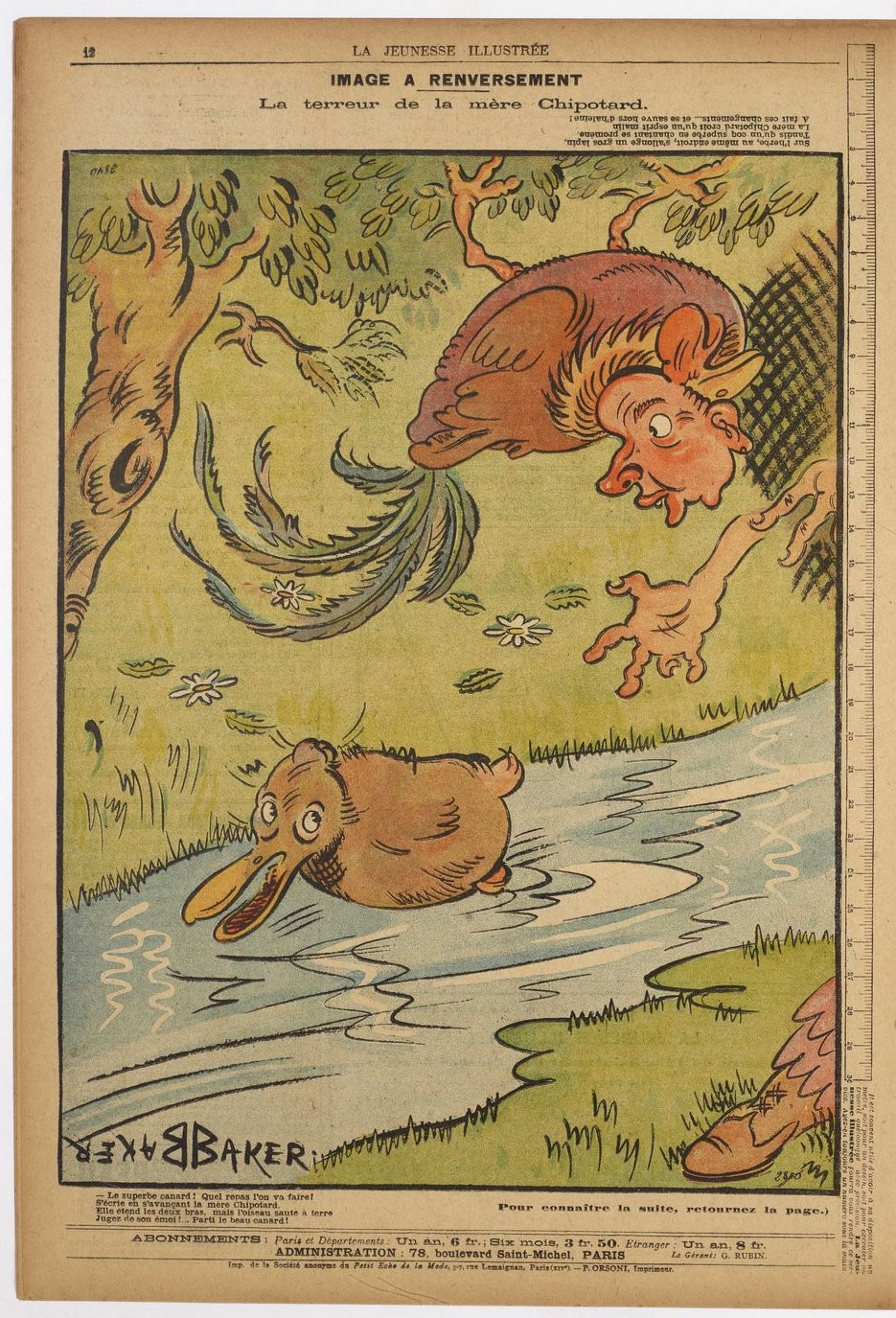 A propos de Baker, on sait peu de chose. Selon le Dico Solo, il collabore à la presse illustrée française (Le Rire, Fantasio, etc.) entre 1902 et 1914. Baker donne ses « Images à renversement » dans La Jeunesse illustrée, de façon ponctuelle, dès le n° 170 du 27 mai 1906. Elles seront reprises en 1913-1914 dans la revue pour enfants Diabolo Journal composée de planches précédemment publiées dans La Jeunesse illustrée. Il semble que celle que nous reproduisons soit la seule directement recopiée des Upside Downs.