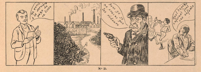 L’utilisation de la bulle dans ce cas-ci est plutôt “rétrograde”, elle correspond au modèle des rébus et des satires graphiques (dont la tradition en Europe remonte aux guerres de religion du 17e siècle). Dans la satire graphique, la bulle n’est pas une image sonore susceptible d”être intégrée comme “bande son” d’un récit sur le mode audiovisuel (ce fonctionnement émerge dans les années 1890 et il est lié au succès du phonographe d’Edison) . Autant que possible, il faut essayer d’éviter de lire les phylactères à l’ancienne comme si c’étaient des bulles.