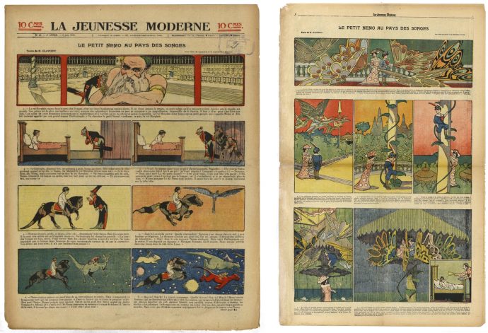 Mise à jour du 26 mars 2018 : La première traduction française de Little Nemo de Winsor McCay fut publiée dans l’hebdomadaire La Jeunesse moderne sous le titre « Le Petit Nemo au Pays des Songes » à partir du 6 juin 1908 et jusqu’à l’arrêt du titre en 1909. Ce journal est aujourd’hui consultable sur Gallica, nous répertorions ci-dessous les pages contenant les épisodes du « Petit Nemo ». Les trois premiers épisodes de la bande dessinée sont publiés en première page, puis à la suite en double page centrale. A partir d’octobre 1908, la série n’apparaît plus qu’une semaine sur deux.