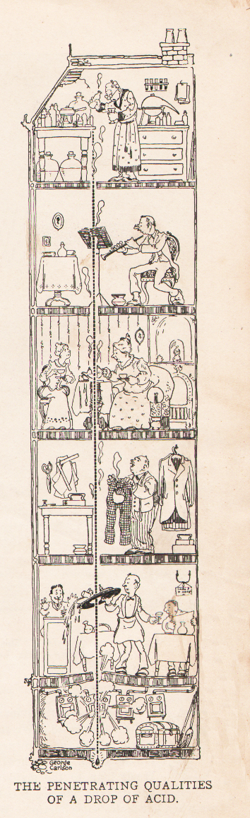 Dans, « The Penetrating Qualities of a Drop of Acid », c’est une goutte d’acide qui permet ingénieusement au dessinateur de trouer les étages d’un immeuble par dans une trajectoire opposée à celle du dessin de Keene vu plus haut…