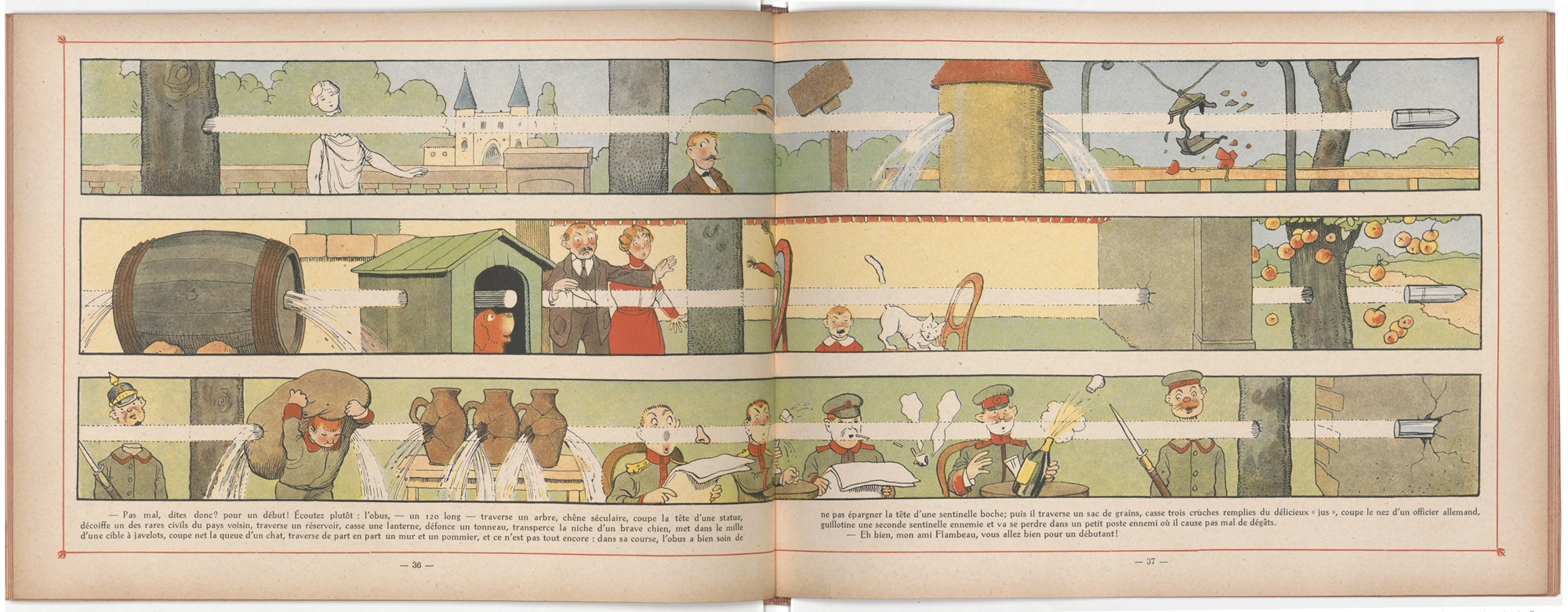 Disposant de plus de liberté formelle dans ses albums que dans la presse pour enfants, Rabier déploie sur une double page trois longs strips dans lesquels on suit le trajet perçant d’un obus de 120 tiré par Flambeau. Contrairement à la planche de La Jeunesse Illustrée, Rabier dessine le projectile en bout de chaque strip et figure, sur toute la longueur de ces images, la trace rectiligne de son passage.