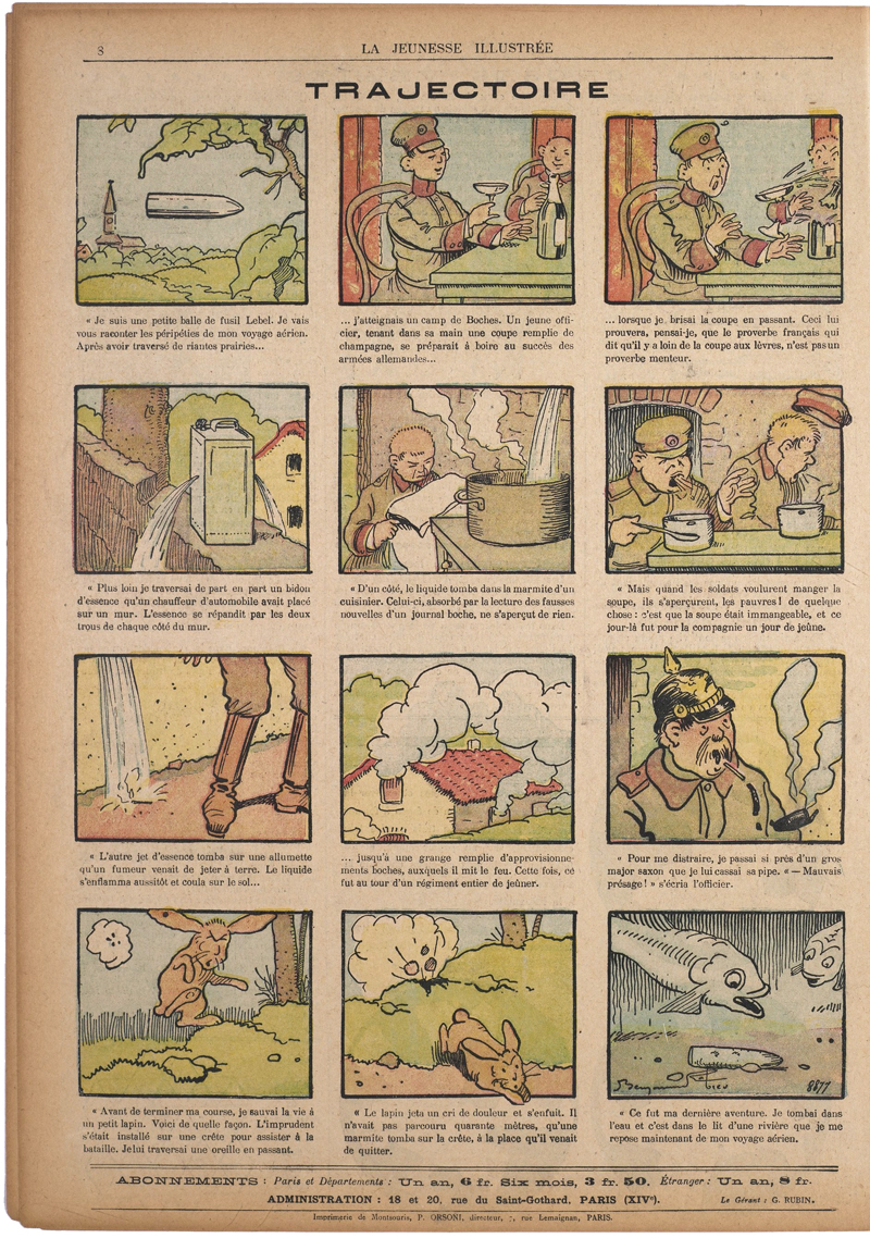 Cette histoire, intitulée « Trajectoire », fut publiée dans La Jeunesse illustrée n° 700 du 11 février 1917, en plein conflit franco-allemand. A l’époque, les jeunes lecteurs ne sont pas épargnés par la propagande, et l’esprit cocardier s’infiltre jusqu’aux histoires pour images de leurs revues. Ici Rabier se plie à « l’effort national » et adapte pour l’occasion un genre d’histoire connu des lecteurs de La Jeunesse illustrée dans lequel la vie d’un objet est retracé au travers de ses propriétaires successifs ou de ses différents usages (1).