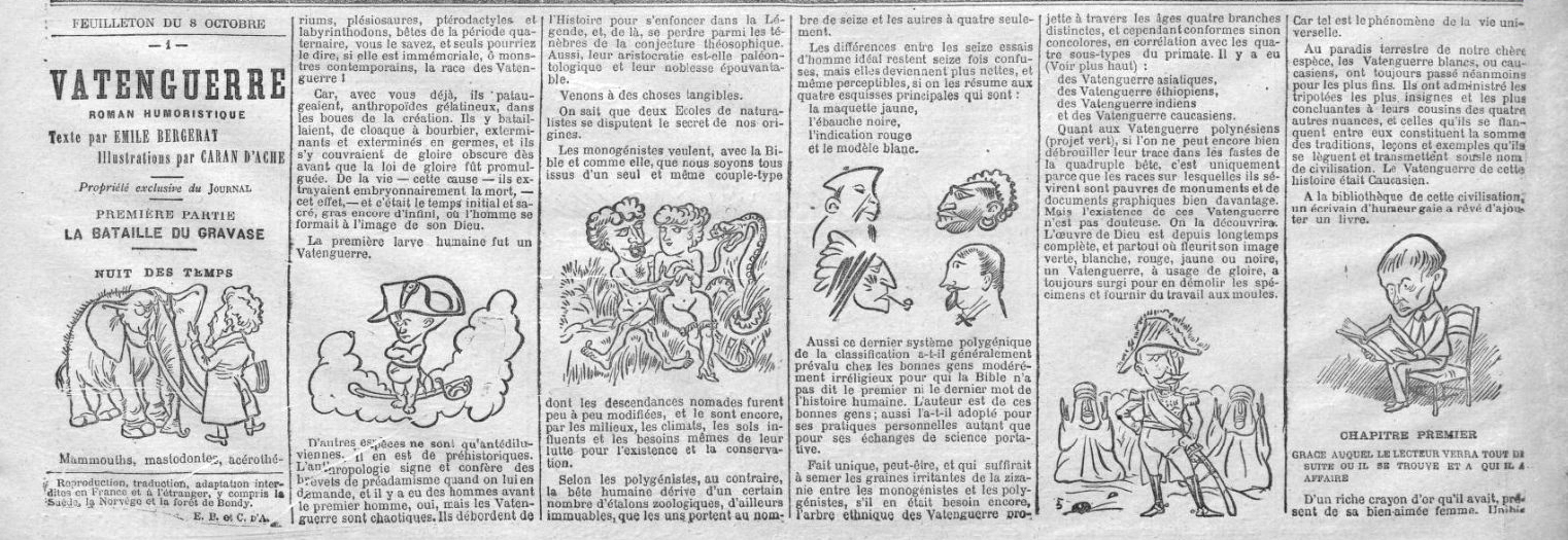 Alors qu’il donne sa page toutes les semaines au Figaro, Caran d’Ache fait pourtant une nouvelle apparition dans Le Journal en 1897. Ce contrat prévoit la publication d’un « roman humoristique et fantaisiste » intitulé Vatenguerre dont le texte est l’œuvre de l’écrivain Emile Bergerat est illustré par Caran d’Ache. Il paraîtra « d’abord en feuilletons successifs et quotidiens, de six colonnes au moins, dans la partie du Journal dite rez-de-chaussée selon l’usage dans la presse parisienne ».