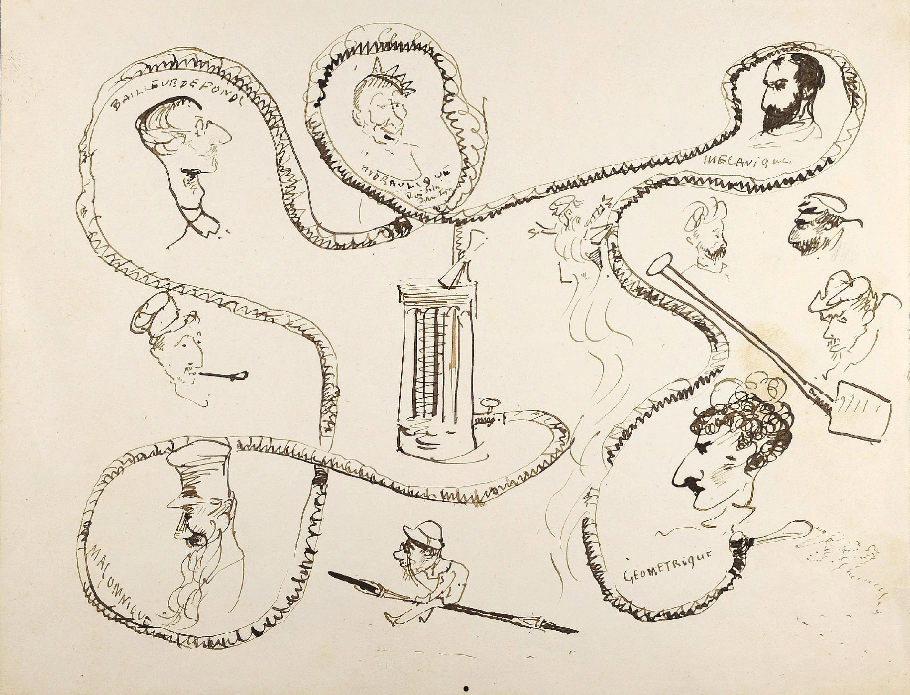 Le frontispice de cet ensemble (voir image en tête d’article) a pour thème central l’irrigateur, cet appareil injection représenté ici avec un tuyau démesurément long enserrant comme dans des médaillons les portraits des protagonistes de l’opération, dont l’oncle Tapié de Celeyran, et le dessinateur-reporter en bas, chevauchant son porte-fusain.