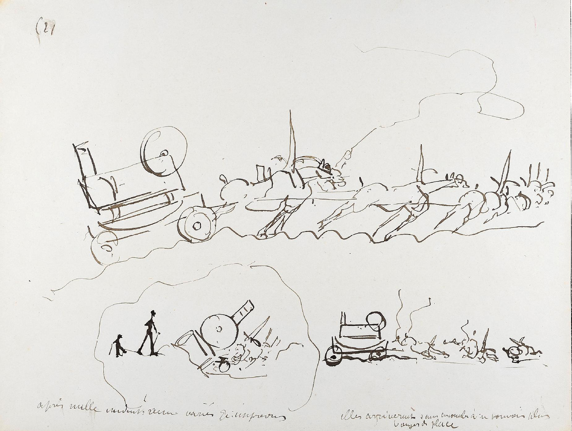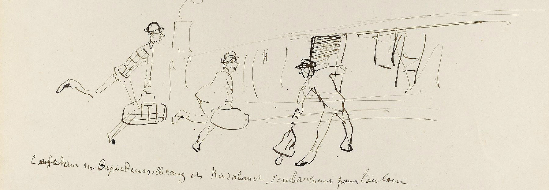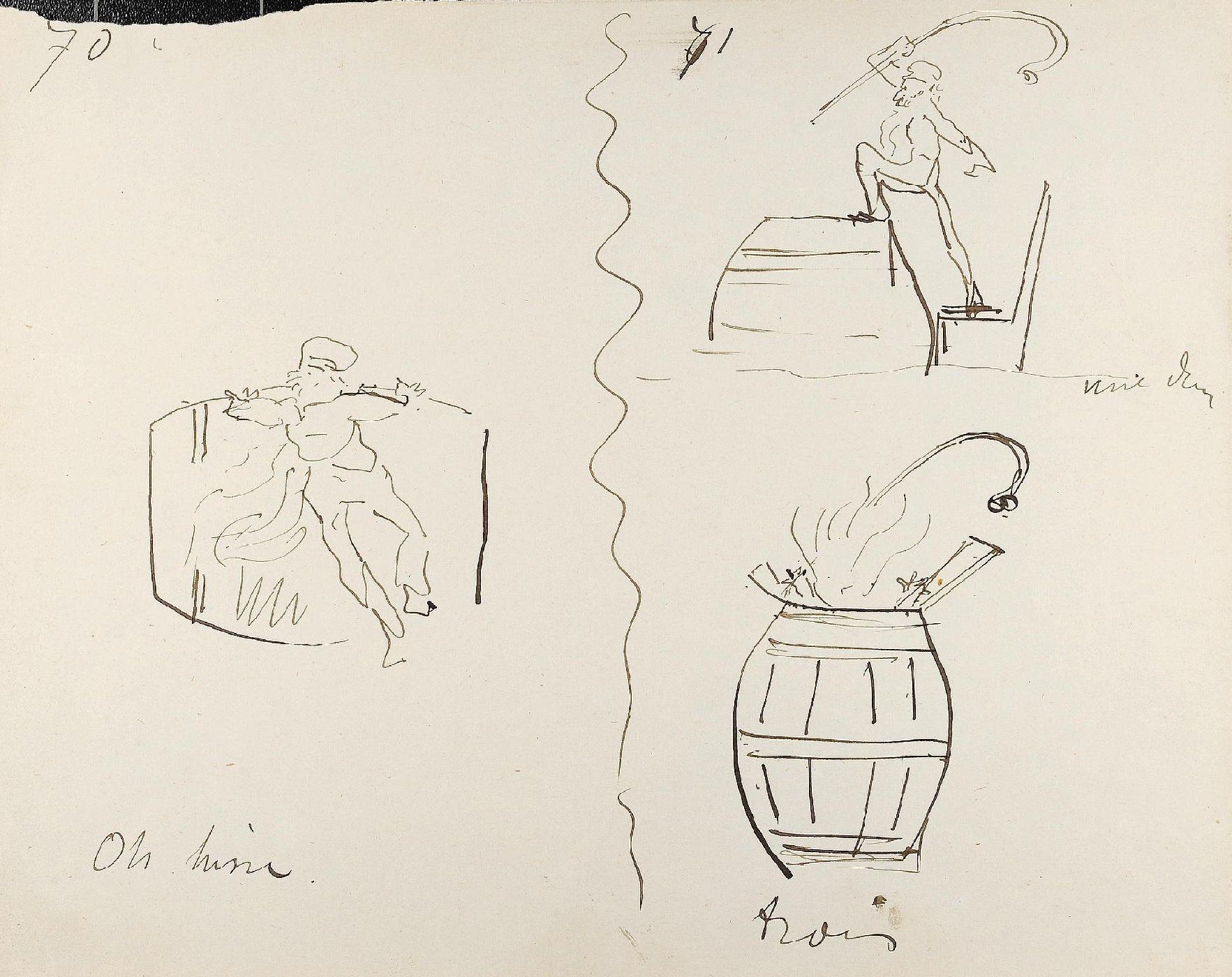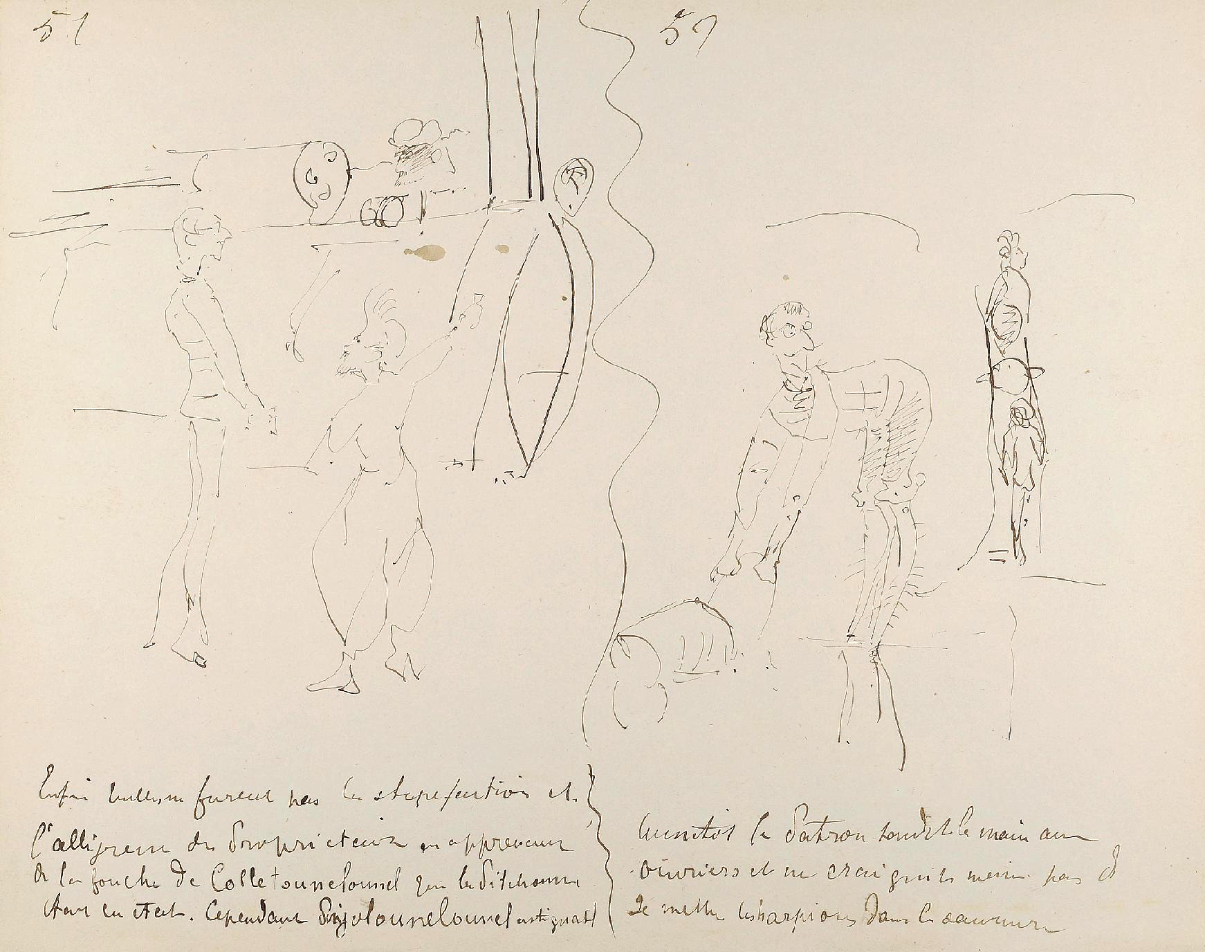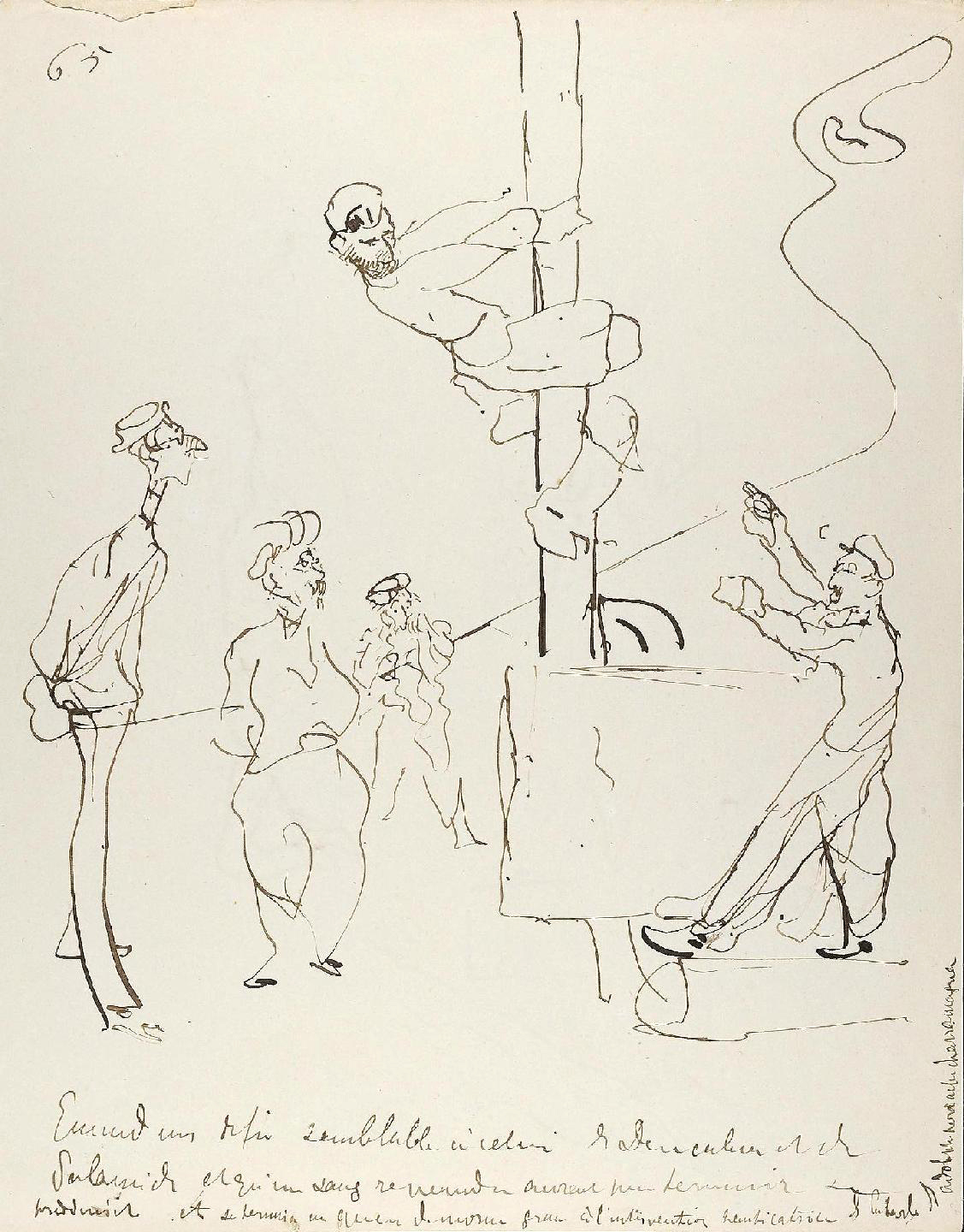 - L’ensemble est composé de 77 dessins à la plume, numérotés, sur 48 feuillets (dim. 18 x 23 cm), non signé. Nos informations proviennent en grande partie du catalogue de l’exposition Toulouse-Lautrec qui se tint à la Hayward Gallery à Londres et au Grand-Palais à Paris en 1992 et qui offre un commentaire détaillé de ces croquis. Ces dessins sont référencés sous les n° D.2160 à D.2208 dans le catalogue raisonné de l’artiste : Toulouse-Lautrec, son œuvre, par M. G. Dortu, New-York, Collector editions, 1971, livre V. Notons enfin que Submersion est également cité dans le livre de David Kunzle, Father of the Comic Strip: Rodolphe Töpffer, University Press of Mississippi, 2007, p. 151.[↩]