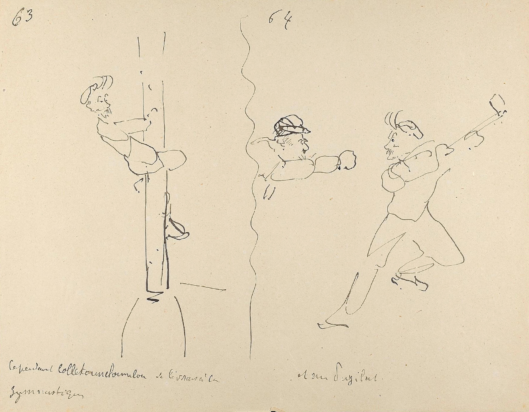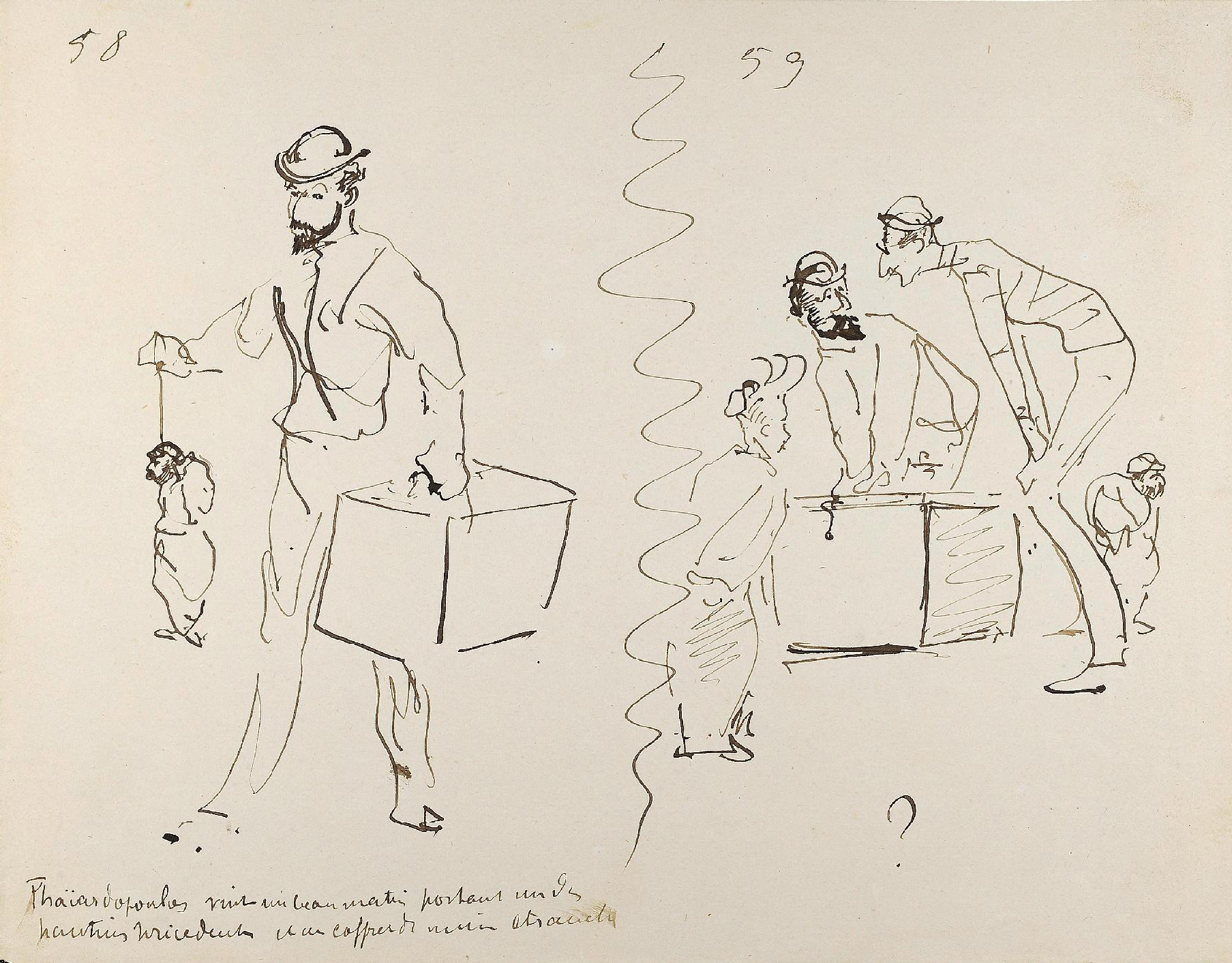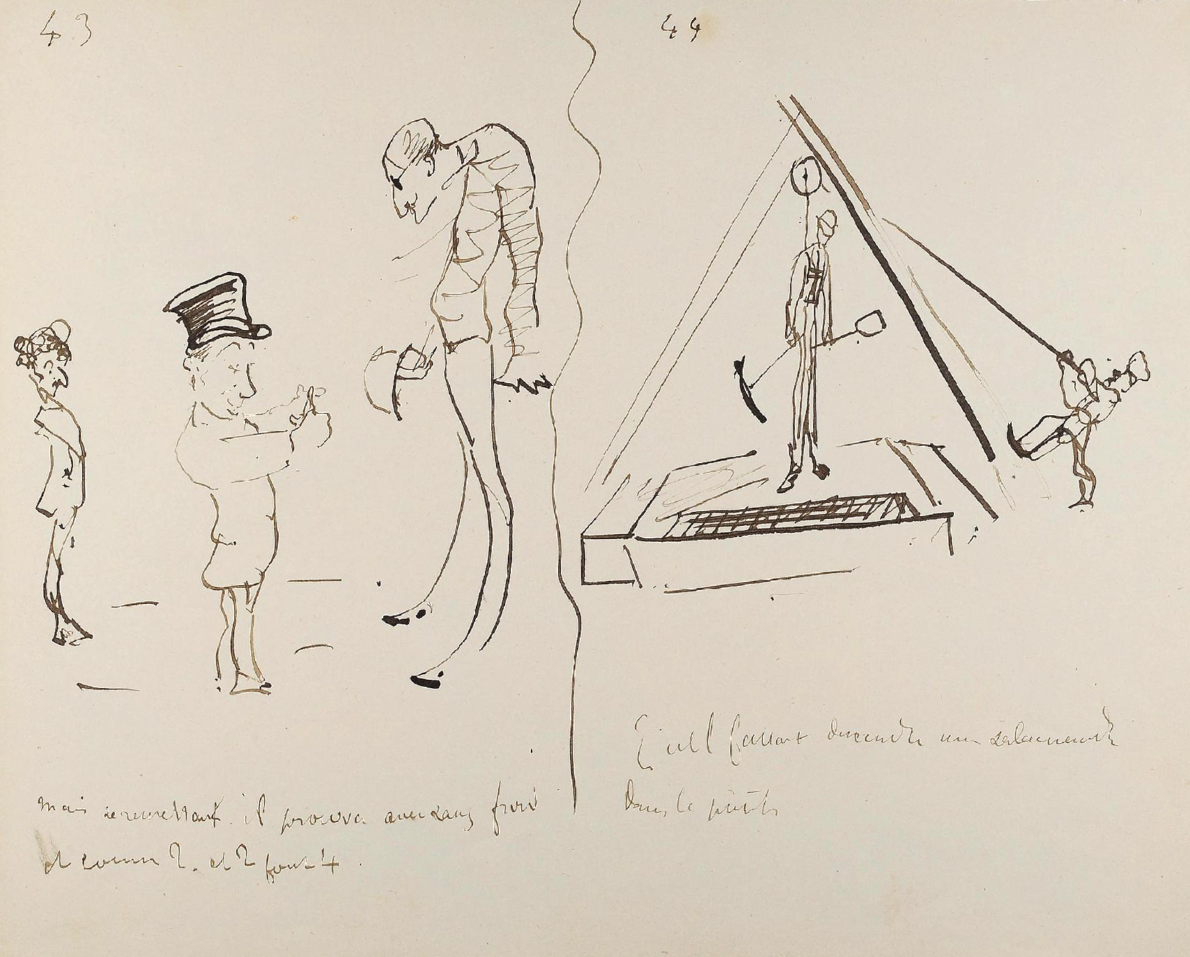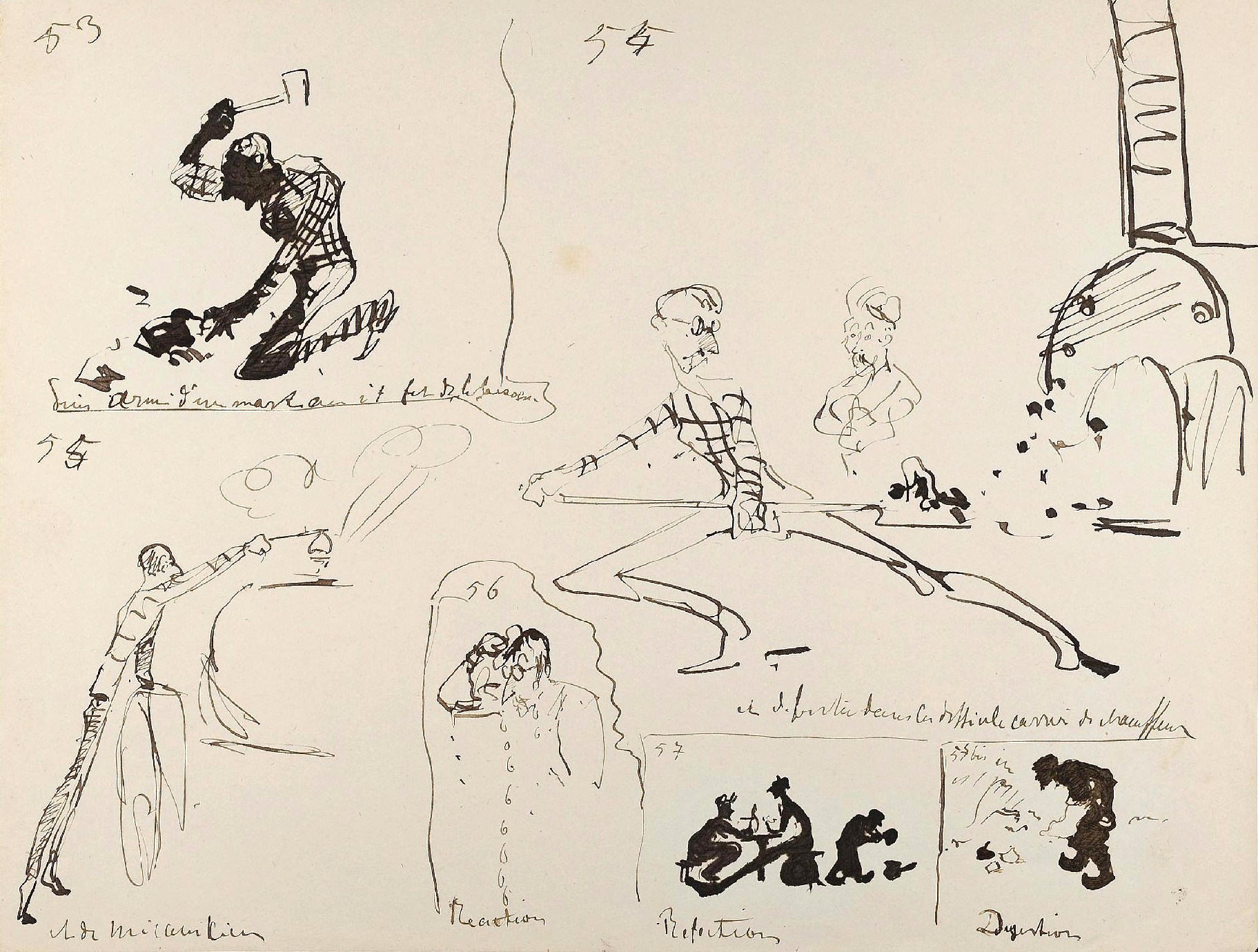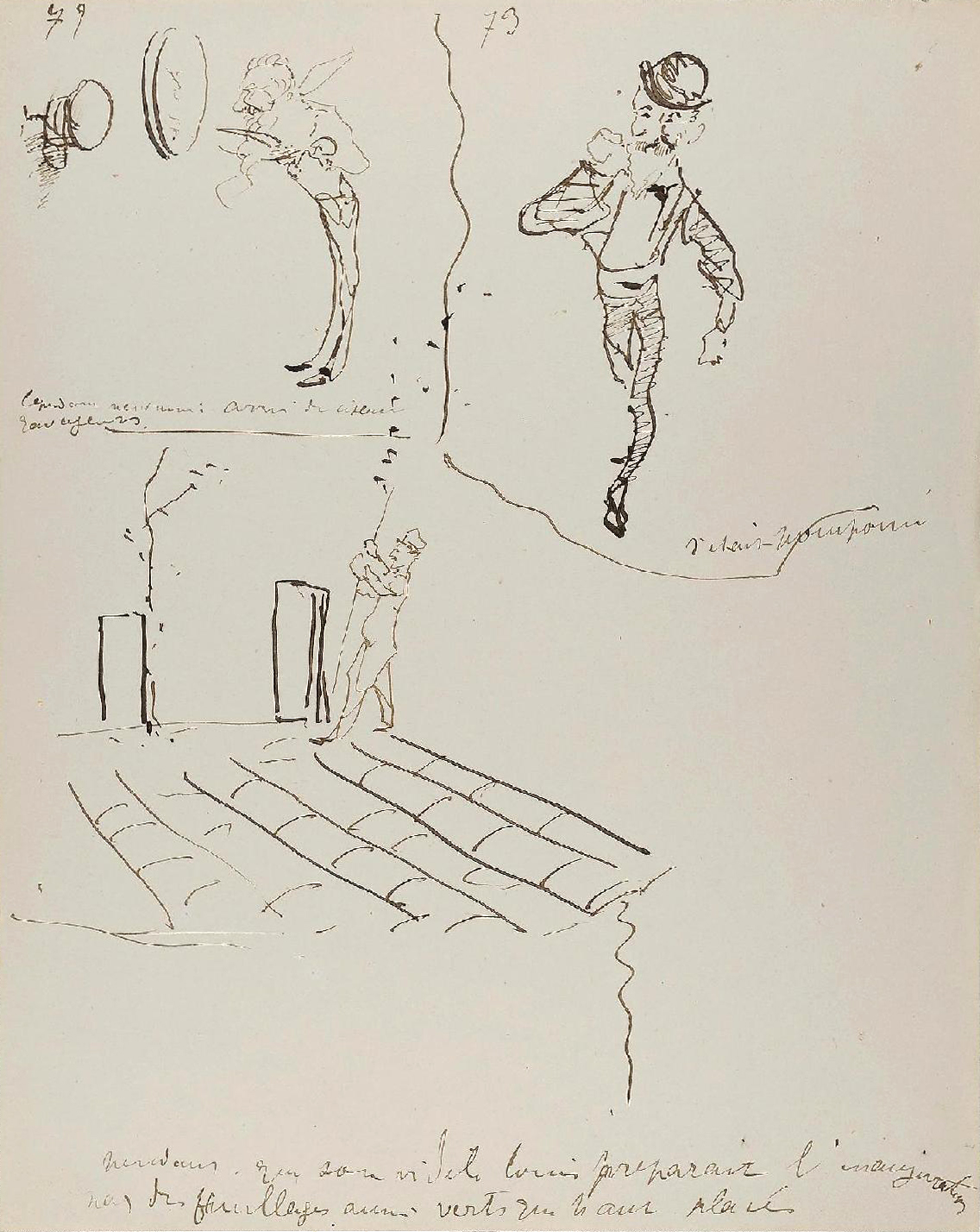 - L’ensemble est composé de 77 dessins à la plume, numérotés, sur 48 feuillets (dim. 18 x 23 cm), non signé. Nos informations proviennent en grande partie du catalogue de l’exposition Toulouse-Lautrec qui se tint à la Hayward Gallery à Londres et au Grand-Palais à Paris en 1992 et qui offre un commentaire détaillé de ces croquis. Ces dessins sont référencés sous les n° D.2160 à D.2208 dans le catalogue raisonné de l’artiste : Toulouse-Lautrec, son œuvre, par M. G. Dortu, New-York, Collector editions, 1971, livre V. Notons enfin que Submersion est également cité dans le livre de David Kunzle, Father of the Comic Strip: Rodolphe Töpffer, University Press of Mississippi, 2007, p. 151.[↩]