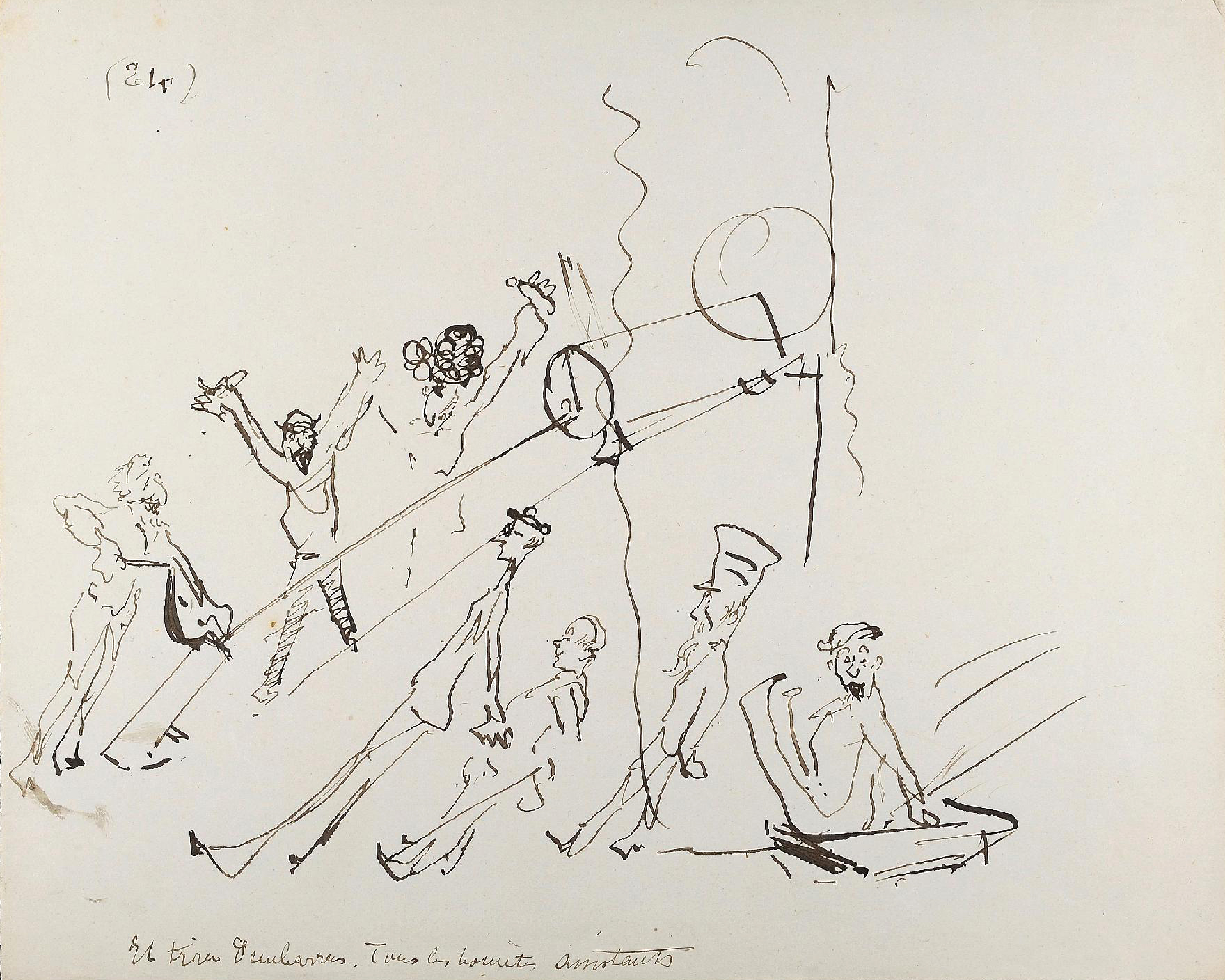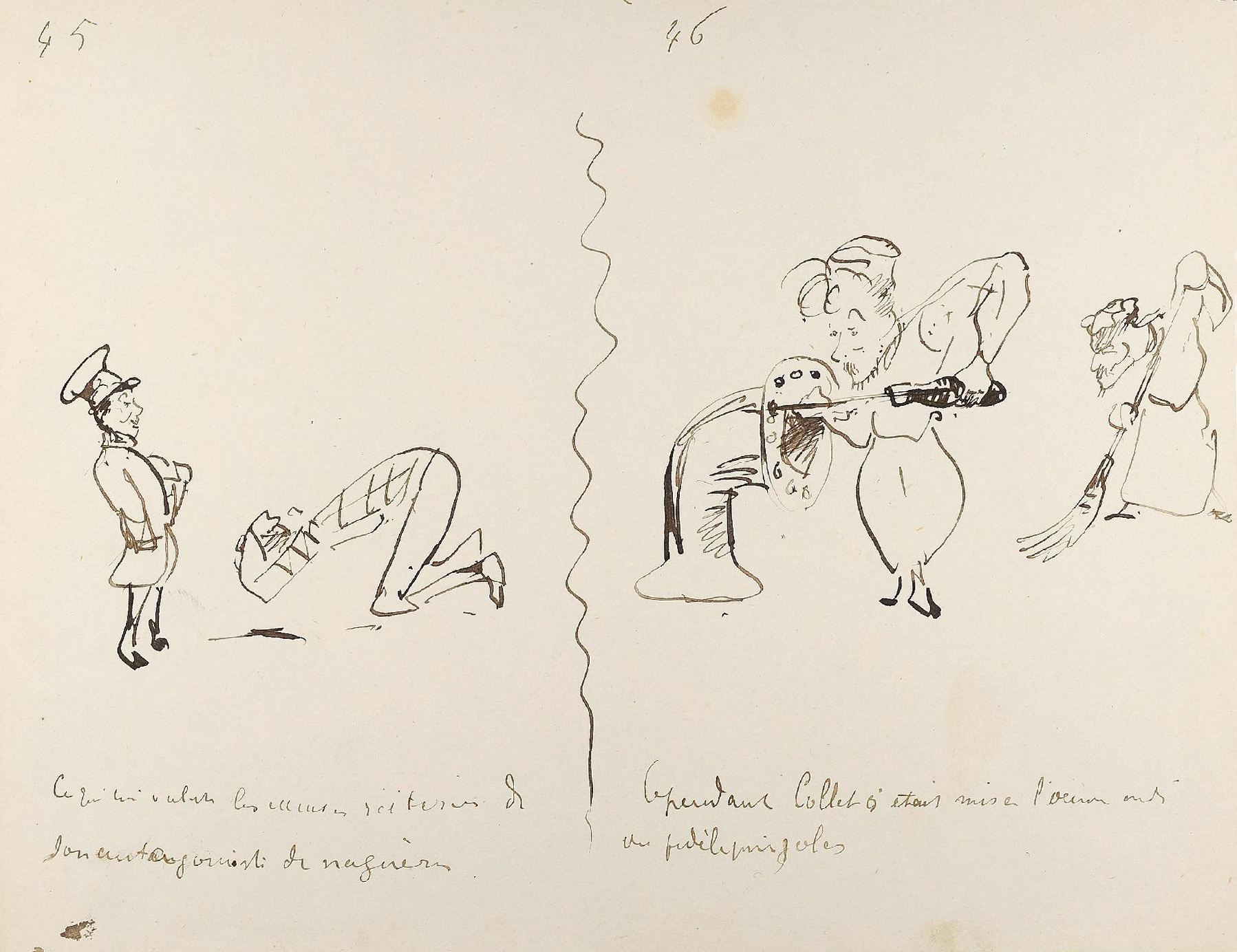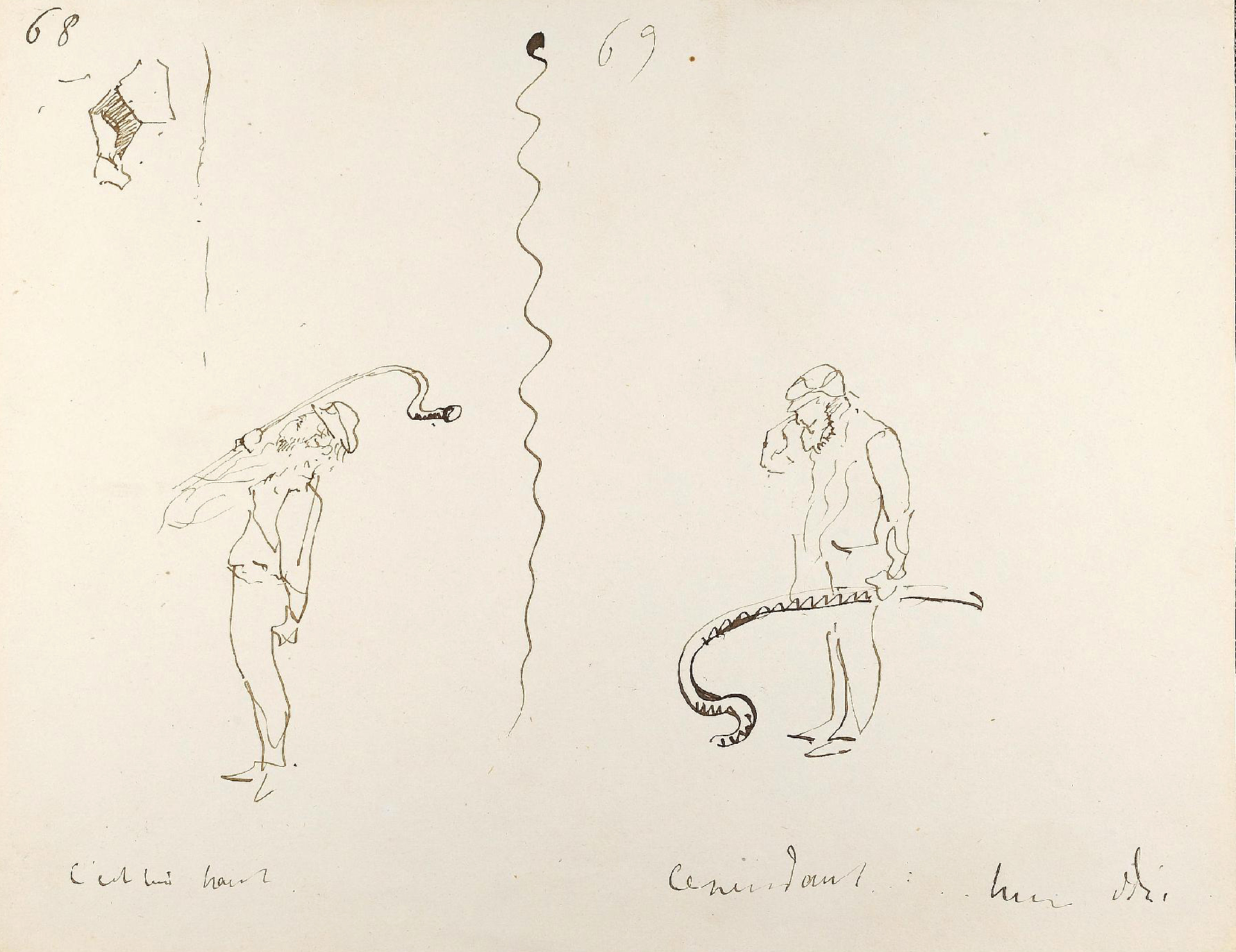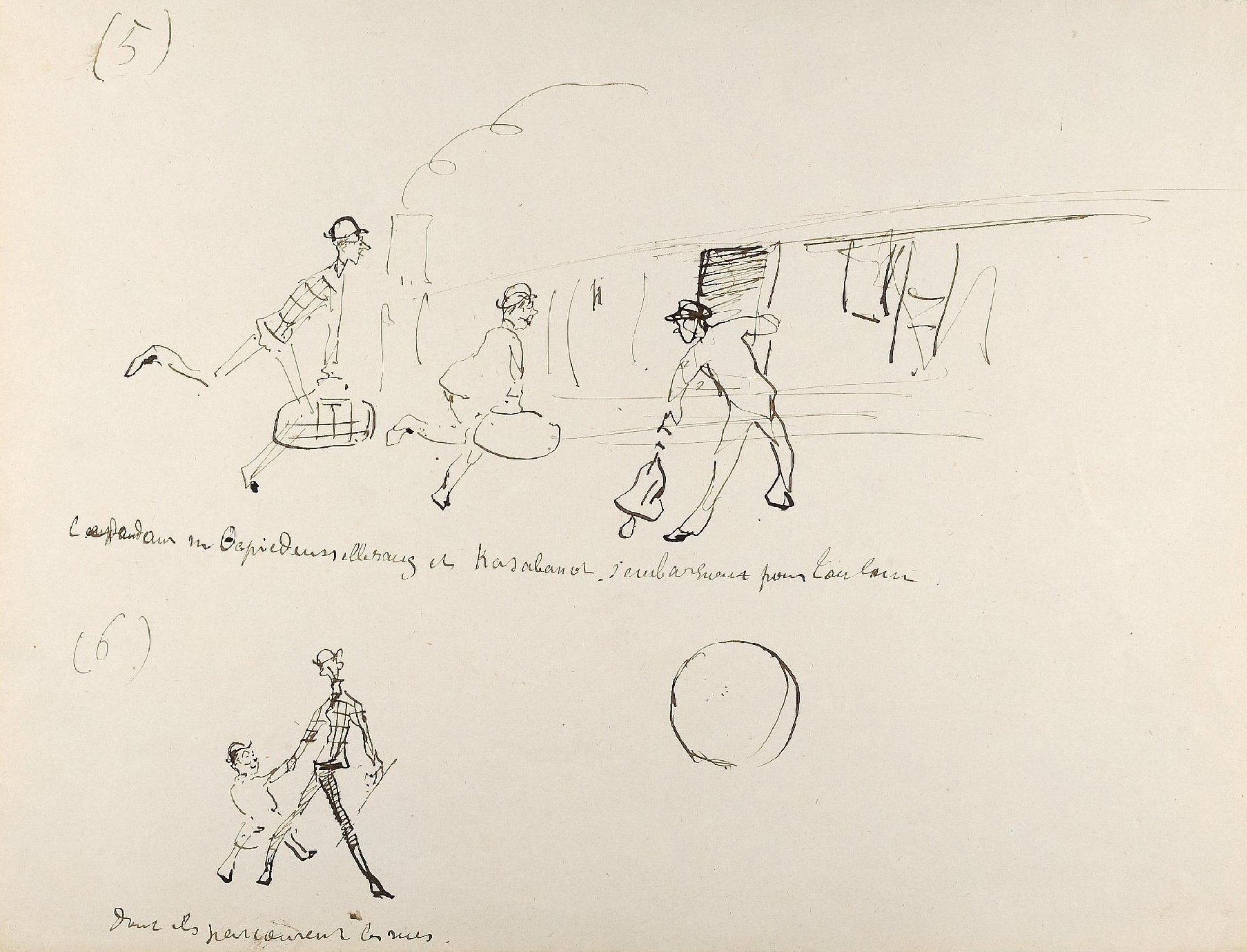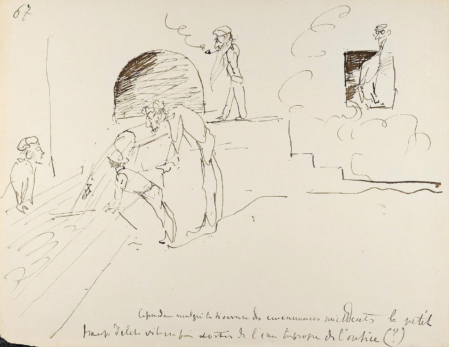 - L’ensemble est composé de 77 dessins à la plume, numérotés, sur 48 feuillets (dim. 18 x 23 cm), non signé. Nos informations proviennent en grande partie du catalogue de l’exposition Toulouse-Lautrec qui se tint à la Hayward Gallery à Londres et au Grand-Palais à Paris en 1992 et qui offre un commentaire détaillé de ces croquis. Ces dessins sont référencés sous les n° D.2160 à D.2208 dans le catalogue raisonné de l’artiste : Toulouse-Lautrec, son œuvre, par M. G. Dortu, New-York, Collector editions, 1971, livre V. Notons enfin que Submersion est également cité dans le livre de David Kunzle, Father of the Comic Strip: Rodolphe Töpffer, University Press of Mississippi, 2007, p. 151.[↩]