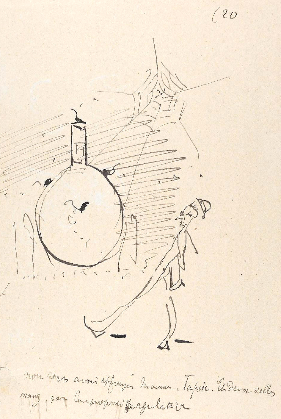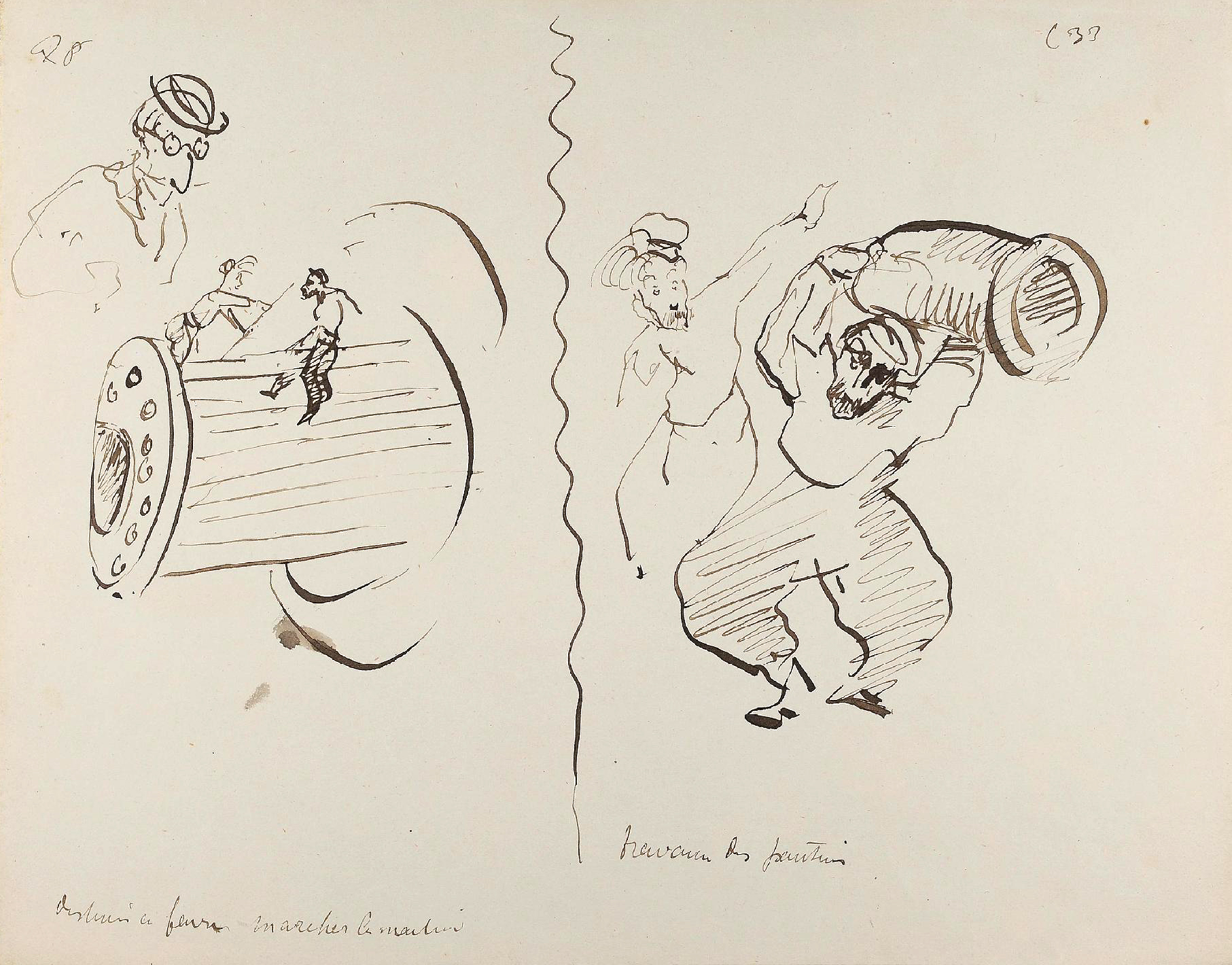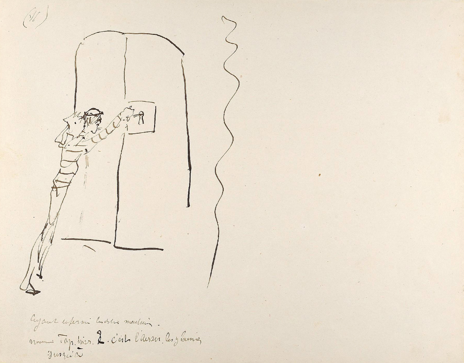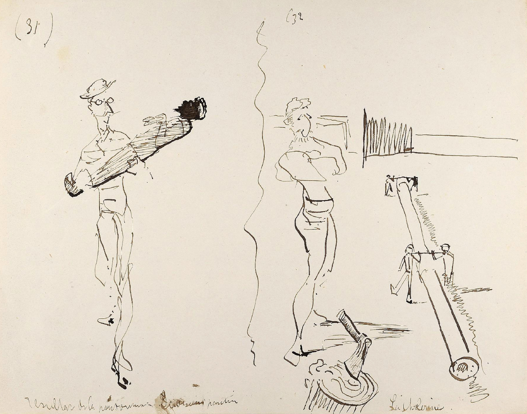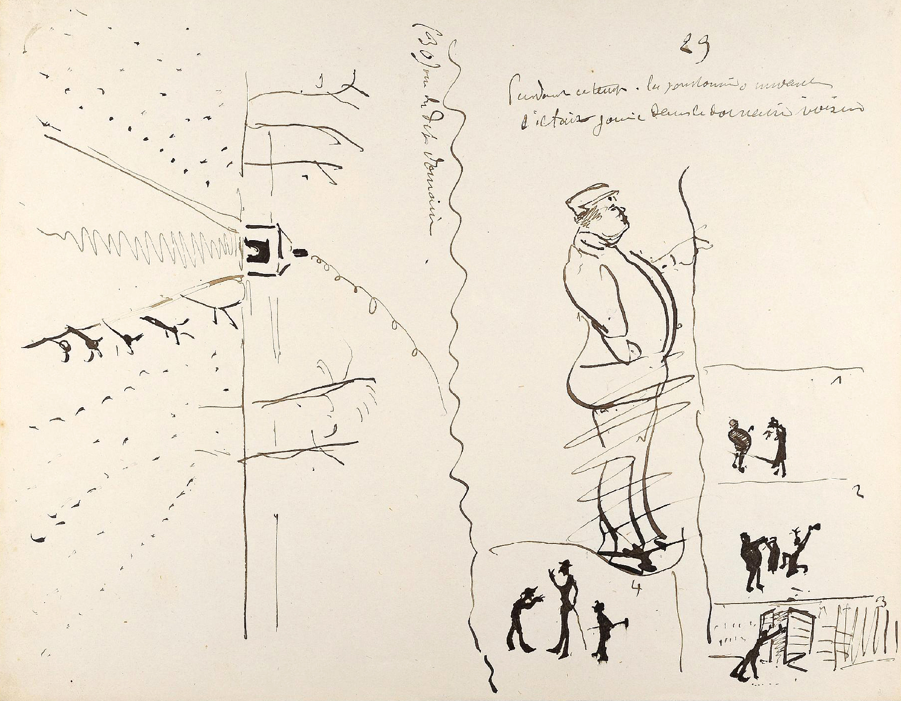 - L’ensemble est composé de 77 dessins à la plume, numérotés, sur 48 feuillets (dim. 18 x 23 cm), non signé. Nos informations proviennent en grande partie du catalogue de l’exposition Toulouse-Lautrec qui se tint à la Hayward Gallery à Londres et au Grand-Palais à Paris en 1992 et qui offre un commentaire détaillé de ces croquis. Ces dessins sont référencés sous les n° D.2160 à D.2208 dans le catalogue raisonné de l’artiste : Toulouse-Lautrec, son œuvre, par M. G. Dortu, New-York, Collector editions, 1971, livre V. Notons enfin que Submersion est également cité dans le livre de David Kunzle, Father of the Comic Strip: Rodolphe Töpffer, University Press of Mississippi, 2007, p. 151.[↩]