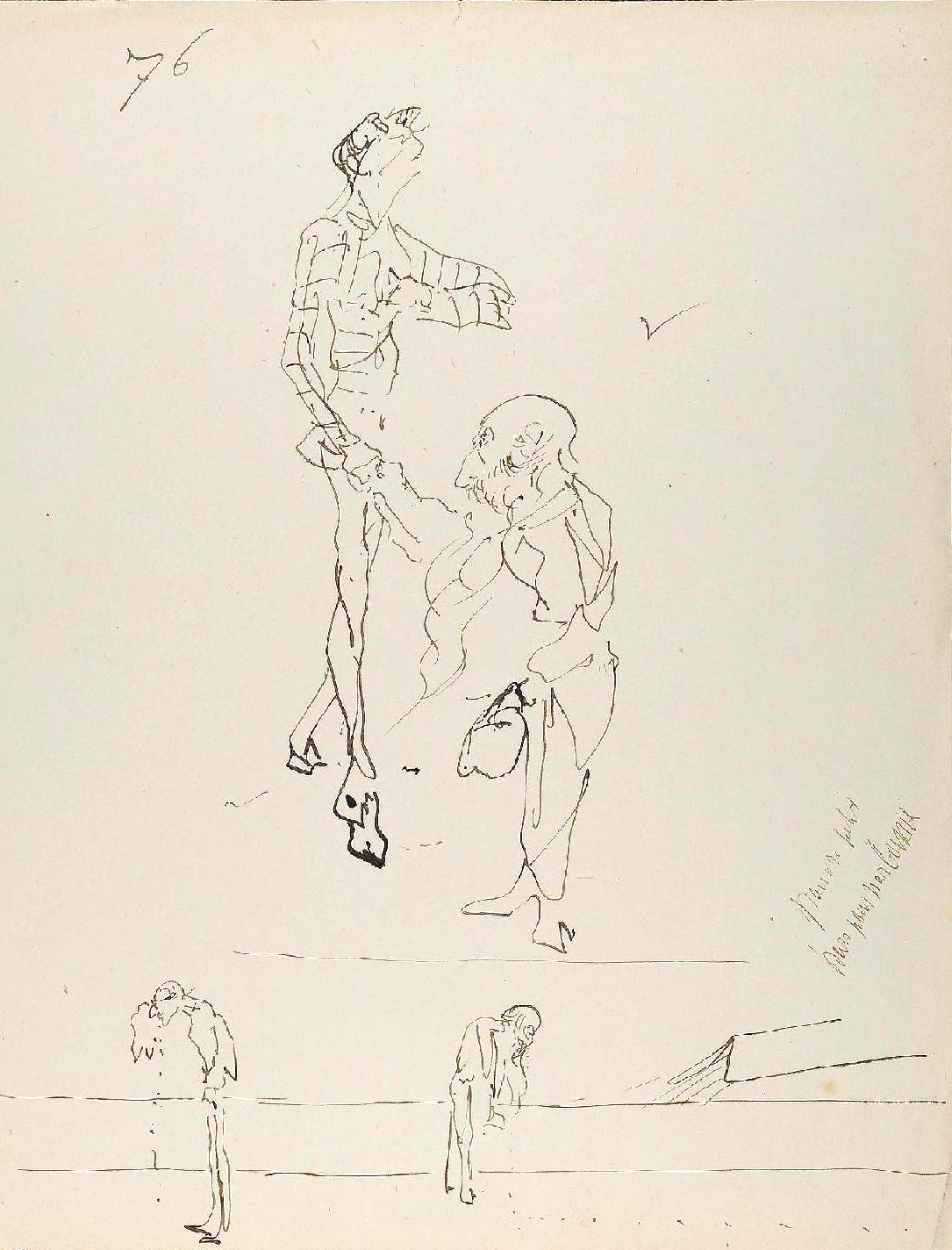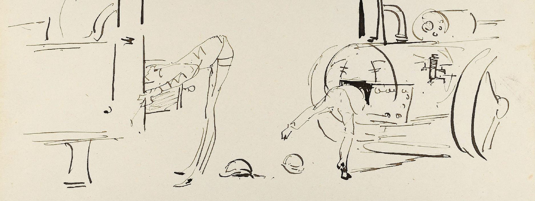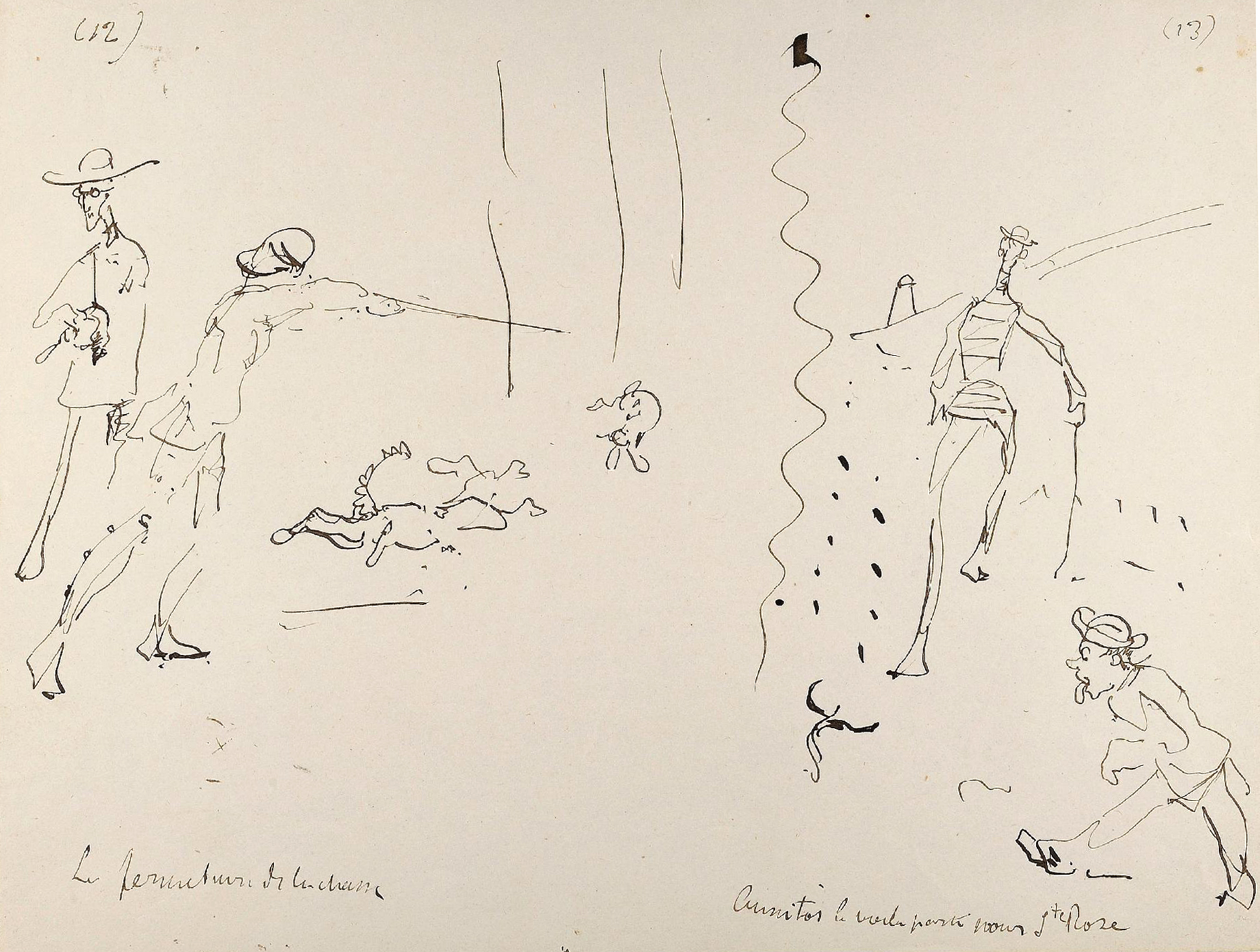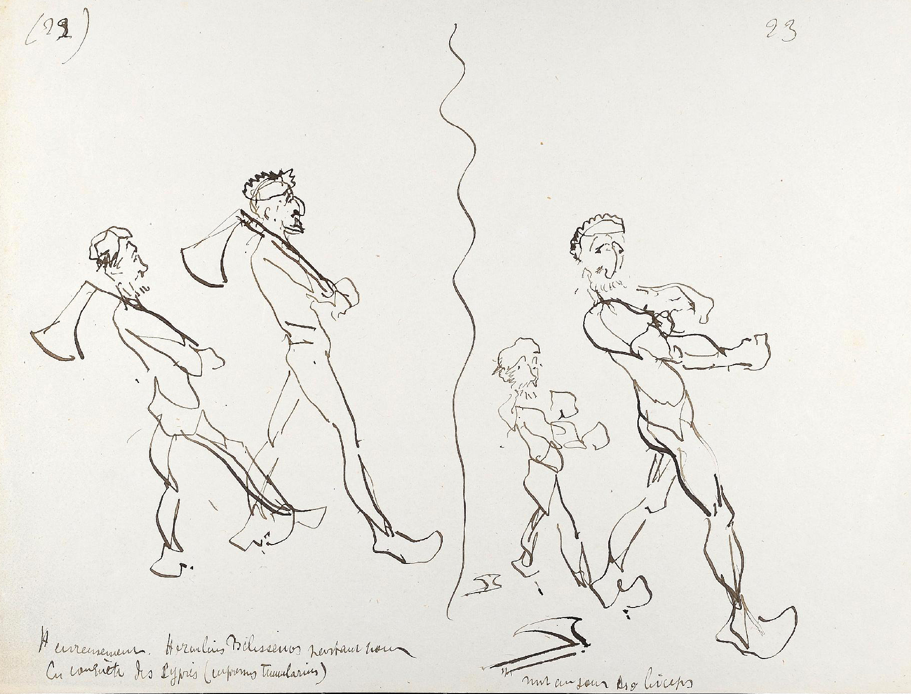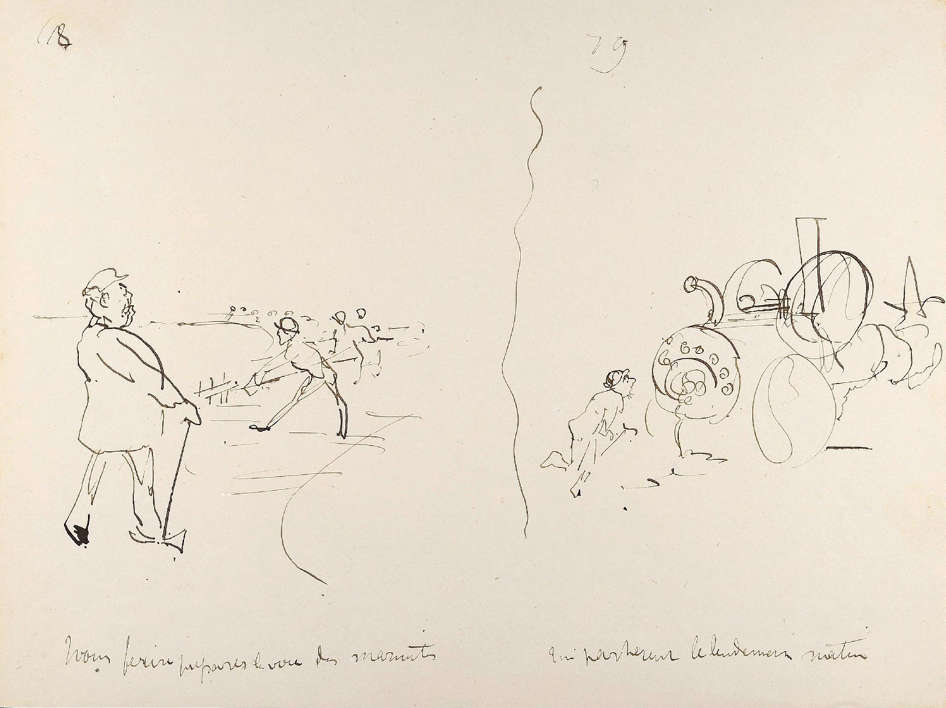 Conservés jusqu’à aujourd’hui dans la famille Tapié de Celeyran, ces dessins furent publiés en 1938 sous le titre Submersion (6). Les croquis originaux ont été présentés lors de l’exposition Toulouse-Lautrec au Grand-Palais de 1992. Ils sont aujourd’hui proposés aux enchères à l’occasion de la vente organisée le 25 juin prochain à Toulouse sous le marteau de Maître Labarbe (avec une estimation de 250 000 à 300 000 euros…). Nous reproduisons à la suite les dessins reproduits sur l’annonce de vente en ligne.