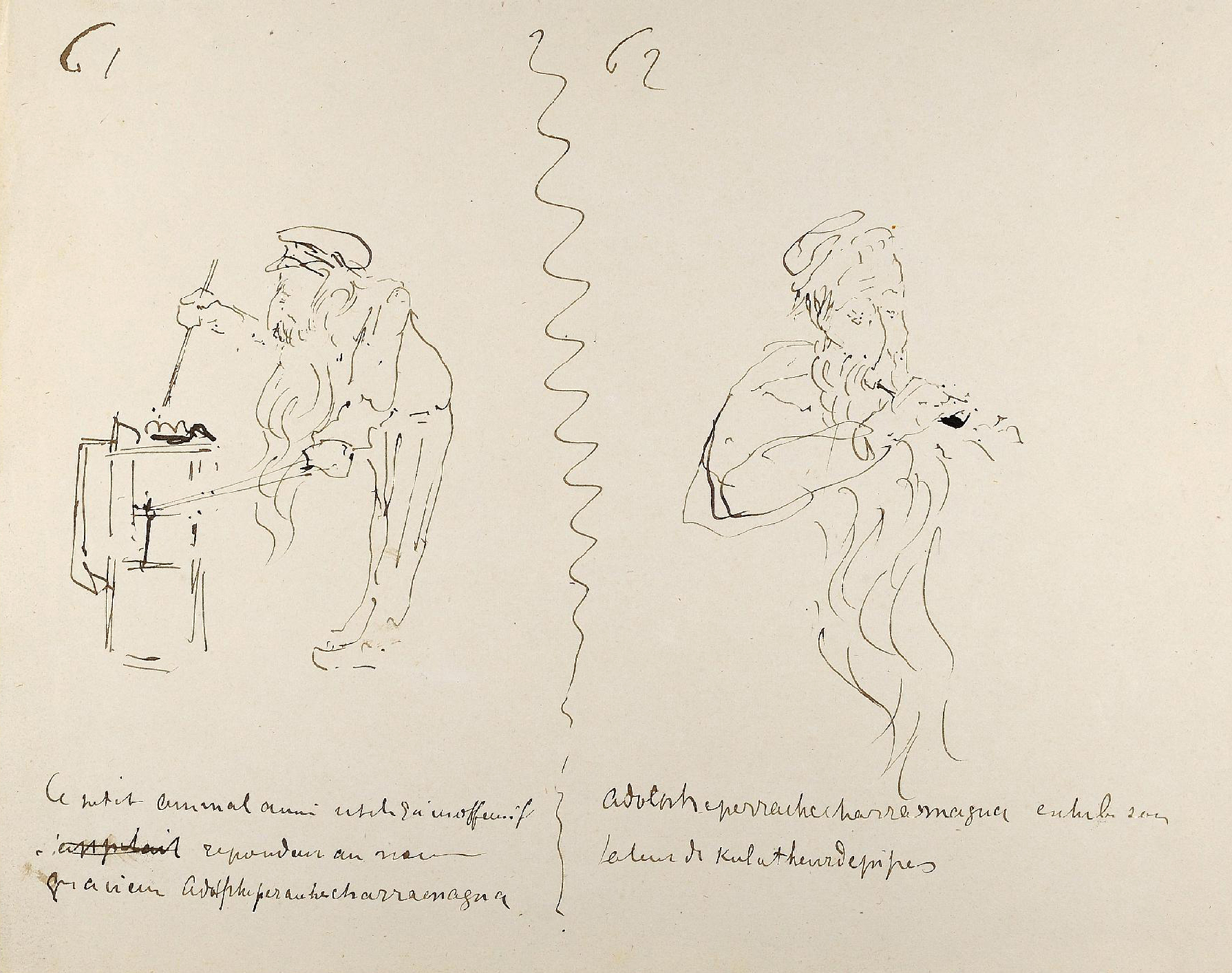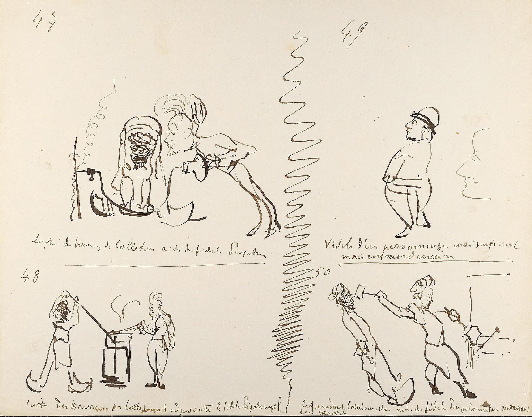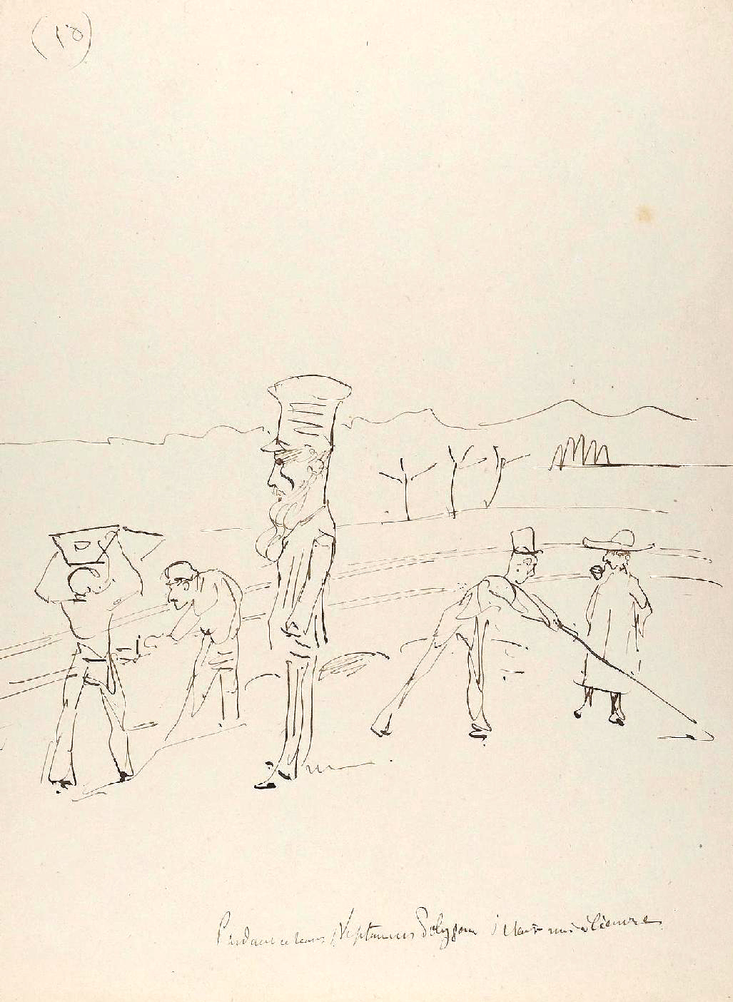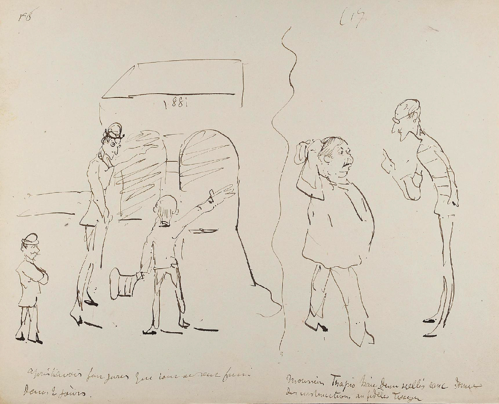 Le jeune artiste, et déjà prodigieux dessinateur, s’essaye ici à la narration en images. Certaines pages présentent des séquences réunissant plusieurs croquis sur une même feuille ; Une courte légende figure sous la plupart des dessins. Cette forme, ainsi que le caractère humoristique et le style graphique, rappellent de très près la « littérature en estampes » de Rodolphe Töpffer, dont Toulouse-Lautrec connaissait l’œuvre. En 1881 également, il avait réalisé Cahier de Zig-Zags, un récit satirique de son voyage à Nice qu’il écrit et illustre pour amuser sa cousine Madeleine Tapié de Celeyran, dont le titre rappelle évidemment les ouvrages du Genevois (5).