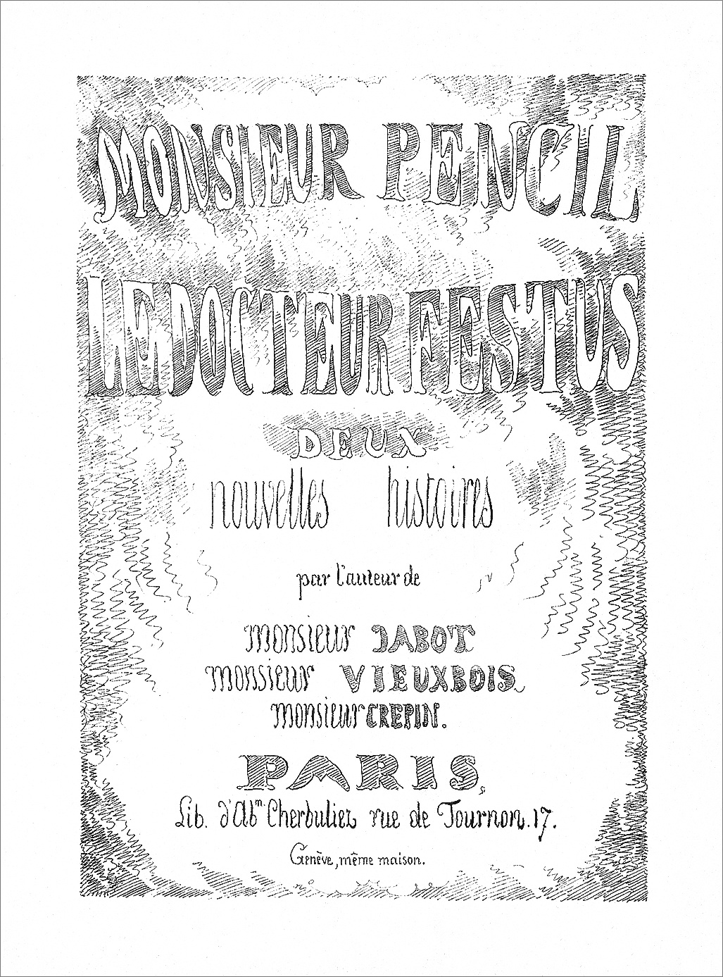 1. Les histoires sont composées à l’encre brune, bleue ou noire, à la plume et au lavis, le crayon graphite sert également la correction des textes. Les dessins et leurs légendes figurent sur le recto des pages tandis que le verso sert parfois de brouillon à l’écriture des textes et à l’élaboration du scénario. Le plus petit volume, Histoire de Mr Jabot, mesure 114 x 183 mm, et le plus grand, Histoire de Mr Crépin, 235 x 310 mm. Le Musée d’Art et d’Histoire conserve les manuscrits de sept histoires publiées au XIXe siècle (la première version de Mr Vieux Bois et les deux versions de Mr Cryptogame) ainsi que ceux d’histoires inachevées ou publiées de manière posthume (M. Trictrac, M. Boissec, M. Calicot, Histoire de M. Fluet et de ses 15 filles et Histoire de M. Vertpré et de Mlle d’Espagnac). M. Trictrac est notamment réédité en 1937, par le Journal de Genève, et en 1988, par les éditions Favre à Lausanne. Les manuscrits de Mr Vieux Bois, Docteur Festus, Mr Jabot, Mr Crépin et Histoire d’Albert sont reproduits en fac-similé et dans leur format d’origine par les éditions Aldo Garzanti à Milan, en 1973. Les légendes sont transcrites en français et en italien sur les pages de gauche.[]