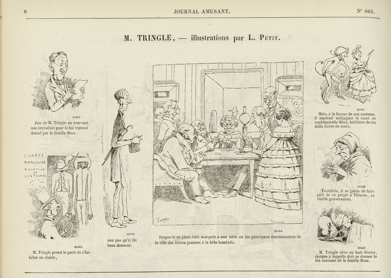 M. Tringle (1867, Le Journal amusant) de Léonce Petit bénéfice lui aussi d’une publication continue, durant trois numéros consécutifs où il figure aux mêmes pages. À propos de ce feuilleton, David Kunzle note qu’il s’agit d’un résumé d’une nouvelle de Champfleury éditée en 1867, dont le frontispice affiche quelques-unes des images de Léonce Petit (40). Il rapproche également ce récit – qui voit M. Tringle déguisé en diable pour une soirée costumée, laquelle n’a pas lieu le jour où il s’y rend, effrayer les habitants d’un village de campagne – de l’Histoire de M. Vieux Bois, sans donner d’autres informations (41). Plusieurs points sont ici à préciser. L’inspiration, Champfleury semble l’avoir puisée dans une farce que le comte Horace de Viel Castel (l’auteur des Aventures du Vte de la Linotière) fait à Paul Foucher (1810-1875, écrivain et beau-frère de Victor Hugo) en 1851, en lui faisant croire qu’il est invité à un bal costumé chez les Ancelot : il s’y rend habillé en archer du XVIe siècle, avec costume collant et hallebarde à la main, à la grande surprise de la famille Ancelot. Cette mystification, parmi d’autres que subit Paul Foucher, est racontée par Viel Castel dans ses Mémoires (42). Elle constitue l’argument de la nouvelle que Champfleury publie d’abord en feuilleton dans La Presse (du 18 au 23 juillet 1865), sous le titre Les Mésaventures de M. Tringle, puis en livre chez Dentu, en 1866. Cette édition comporte effectivement une page de titre où figurent des dessins de Léonce Petit et une préface parodique dans l’esprit du récit excentrique, dans laquelle l’auteur ouvre « un concours pour l’illustration de la septième édition de M. Tringle ». Il y énonce les qualités graphiques que ces illustrations doivent avoir, reprenant les principes de l’esthétique töpfferienne (43) :