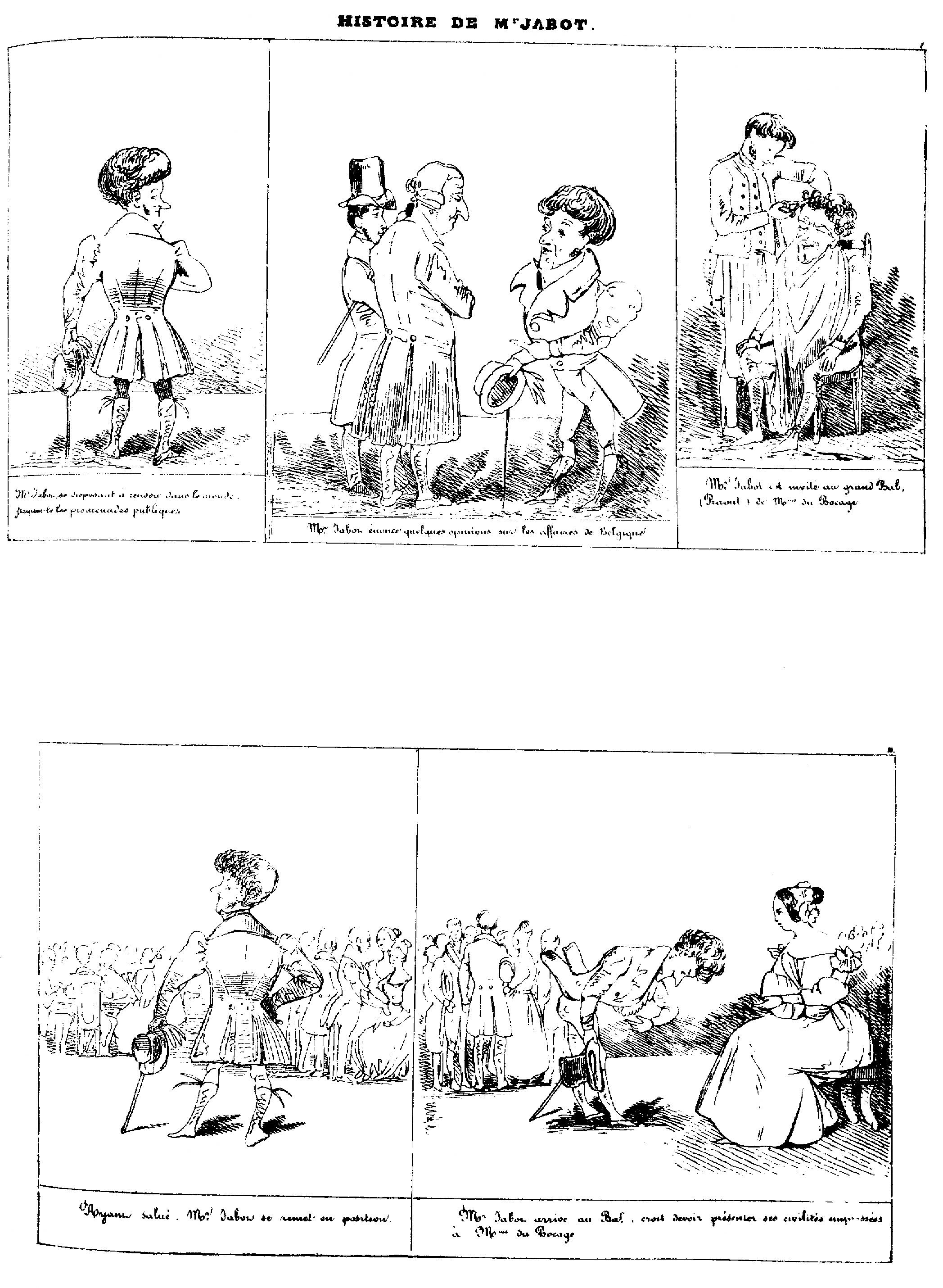 Texte : « Mr Jabot se disposant à réussir dans le monde fréquente les promenades publiques. » / « Mr Jabot énonce quelques opinions sur les affaires de Belgique. » / « Mr Jabot est invité au grand Bal, (Raout) de Mme du Bocage. » / « Ayant salué, Mr Jabot se remet en position. » / « Mr Jabot arrivé au bal, croit devoir présenter ses civilités empressées à Mme du Bocage ».