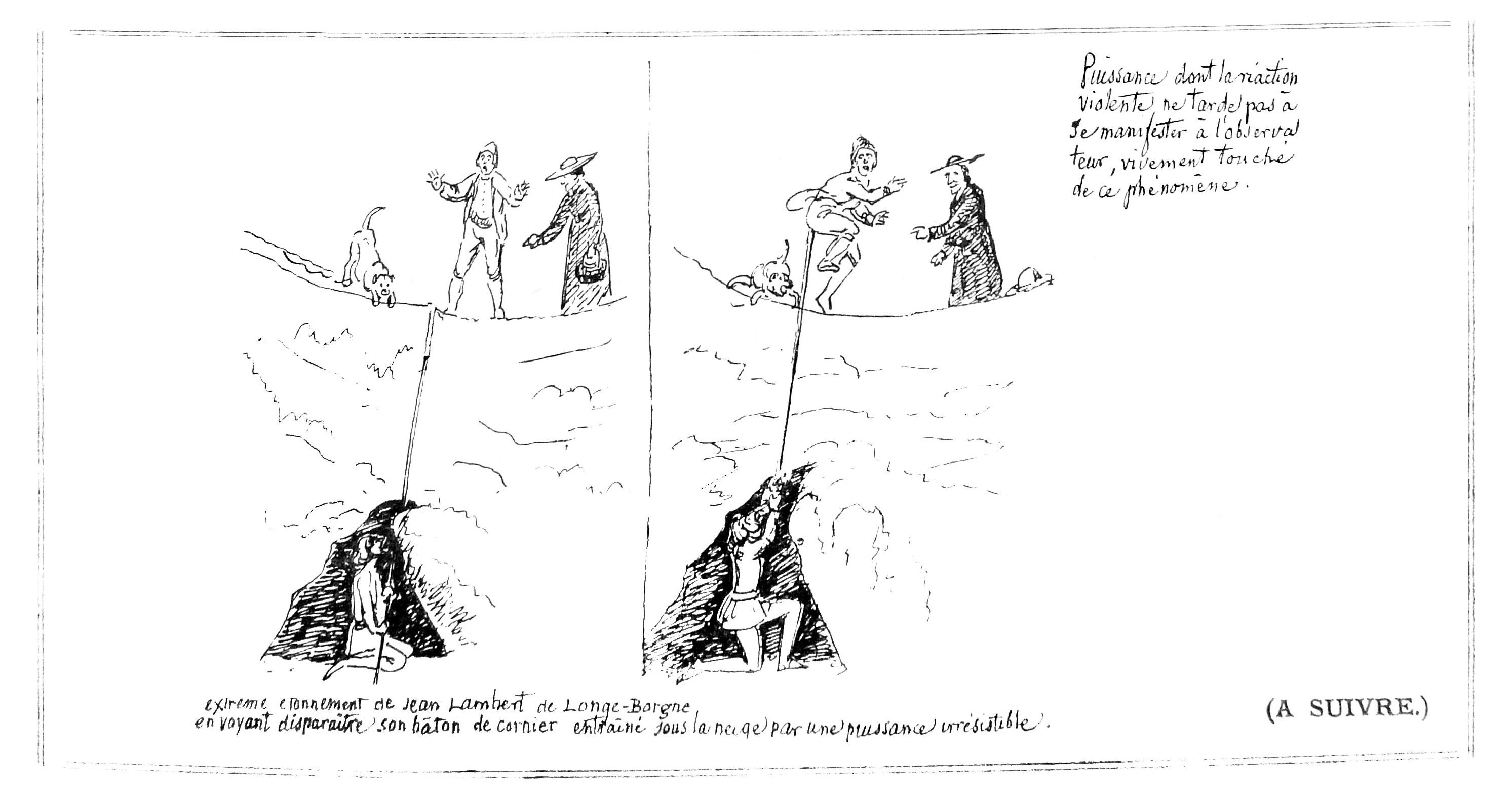 Texte : « Extrême étonnement de Jean Lambert de Longe-Borgne en voyant disparaître son bâton de cornier entraîné sous la neige par une puissance irrésistible. / « Puissance dont la réaction violente ne trade pas à se manifester à l’observateur, violemment touché de ce phénomène. »
