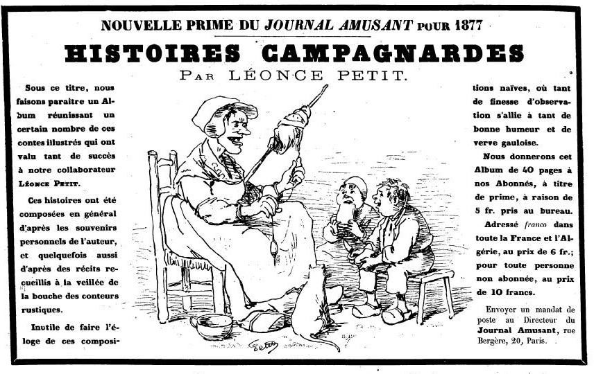 J’ai souvent vu Léonce Petit, le peintre des « Bonnes gens de province », chanter en faisant les dessins au trait que tout le monde a vu dans le Journal Amusant ; en dessinant le contour de certains de ses personnages qu’il avait connus, soit à Dinan, soit à Valognes, il leur parlait, leur donnait des noms, et se racontait à lui-même, presque à haute voix, des épisodes de leur vie. (50)