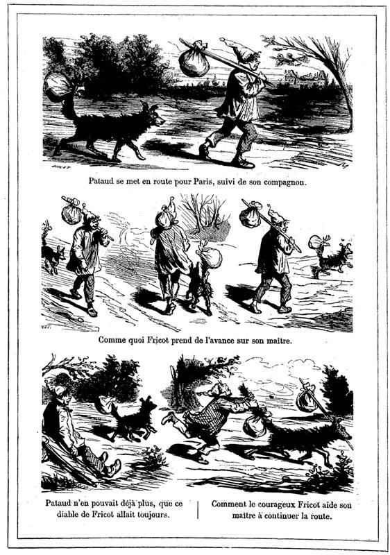 Comme pour trancher avec le mode narratif précédent et confirmer « l’entraînante gaieté de ses dessins » annoncée par Stahl, Cham laisse parler les images : très brèves dans les premières planches, les légendes se limitent à décrire l’enchaînement serré des gravures – « Comme quoi Fricot prend de l’avance sur son maître », « Comment le courageux Fricot aide son maître à continuer la route ». Les rôles du texte et de l’image s’en trouvent brusquement inversés. Le rythme narratif y est totalement différent, les péripéties se succèdent rapidement, par le biais de transitions faciles ou farfelues, dans un esprit de fantaisie typique des histoires du caricaturiste : dans cette seconde partie d’environ trente pages, les deux amis passent la nuit dans un grenier infesté de rats, font la rencontre du Juif errant, sont arrêtés à Paris par un commissaire qui emprisonne Pataud tandis que Fricot est capturé par un vivisecteur, le garçon rencontre ensuite une somnambule, le polonais Chicotski, dentiste américain, puis le frère du notaire client du dentiste, M. Peau-de-Loup (64), maître de pensionnat, etc. L’humour cette fois se fait dans le grotesque, le non-sens, les décalages texte / image, les changements brusques de ton et dans la satire légère (le sous-préfet, le garde champêtre, les commissaires sont gentiment moqués par le caricaturiste). C’est que Cham n’a pas carte blanche pour cette histoire dont il donne l’impulsion :
