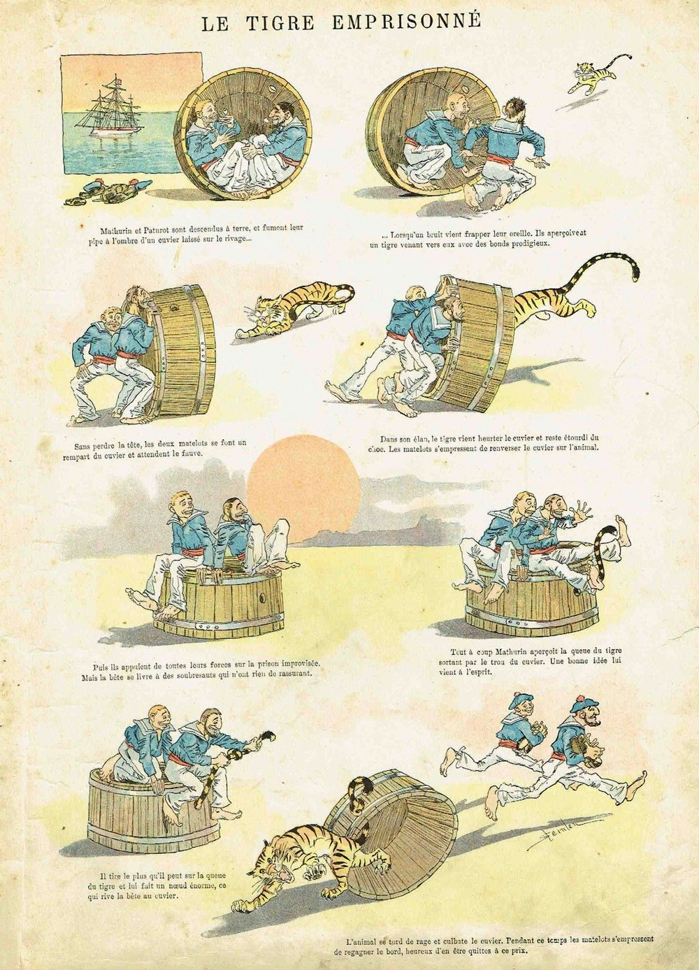 Comme les imagiers empruntaient des thèmes au pot commun de la culture, les dessinateurs de l’imagerie popularisée n’hésitent pas à puiser dans le vivier de gags disponibles et se faire l’écho de productions antérieures. Un exemple nous est donné par l’adaptation en bande dessinée d’un récit illustré pour la jeunesse. Il s’agit d’un court feuilleton écrit par Charles Plémeur et ponctué de vignettes signées B. Castelli, intitulé Le Lion désappointé et publié par La Semaine des enfants (n° 184 du 07.07.1860 et n° 185 du 14.07.1860). Il est mis en livre par l’éditeur E. Ardant en 1875 puis repris en 1876 dans l’ouvrage éducatif de Mme Doudet (pseudonyme de Théodore Lefèvre), Bébé sait lire. Suite au grand Alphabet-Album Bébé saura bientôt lire. Courtes historiettes enfantines servant d’exercices de lecture. Le feuilleton présente l’histoire de deux matelots, Cadet Verlinac et Anthime Géry, envoyés à terre remplir une tonne d’eau ; elle est racontée par un narrateur intradiégétique. Pour sa part, Mme Doudet écourte l’histoire pour ne conserver que le récit enchâssé. Seules les neuf illustrations restent inchangées mais leur disposition est simplifiée – dans La Semaine des enfants, les images devancent systématiquement les événements narrés si bien qu’une légende accompagnée de la référence au passage concerné leur est nécessaire. La planche Quantin réalisée par Théophile-Alexandre Steinlen s’intitule Le tigre emprisonné (fig. 39) et se contente de monter en séquence les illustrations redessinées du Lion désappointé. Les images donnent à voir la manière dont les deux matelots, devenus Mathurin et Paturot, échappent à l’attaque d’un tigre en l’emprisonnant sous leur cuvier, puis en nouant sa queue sortie d’un trou. Chacune des images reprend son modèle quasiment à l’identique : les angles de vue, le placement et la posture des personnages sont les mêmes. Du récit illustré à la bande dessinée, ne subsiste que l’essentiel de l’action, c’est-à-dire l’astuce défensive qui se prête parfaitement à une représentation visuelle. Au contraire des précédents cas d’adaptation, point de moralisation additionnelle mais plutôt une évacuation de tout l’appareillage éducatif entourant l’histoire. Quand la version de Plémeur pointait la filouterie et celle de Mme Daudet la paresse, Le tigre emprisonné de Steinlen ne souligne que l’ingéniosité divertissante des héros. Le dessinateur trouve la manœuvre féconde puisqu’il fait suivre cette feuille d’une variante construite sur un canevas strictement similaire. Dans Le Lion enfumé (s7-n5), le fauve  n’est plus maîtrisé grâce au nouement de sa queue mais par des bouffées de fumée lancées par le jeune Yvonnet au travers du trou. Une fois encore, les deux planches forment une unité puisque l’on retrouve le personnage de Mathurin « appuyé sur le cuvier, [qui] racontait au mousse Yvonnet la mésaventure du tigre ». Face au lion qui bondit dans leur direction, le matelot « veut user du stratagème qui lui a déjà réussi ». Pour appuyer la continuité, le titre reprend le groupe nominal, et la mise en page, du découpage aux attitudes des protagonistes, est fidèlement reproduite. Graphiquement, des éléments de rappel sont placés, comme les aplats jaunes figurant le sol ou le médaillon laissant voir un bateau près d’une île. Ce médaillon non seulement fait pendant au carré introduisant la première planche et ouvrant sur une même scène maritime, mais prend place dans l’espace de la feuille à l’endroit où figure un imposant disque solaire dans Le tigre emprisonné. L’intention dissuasive à l’égard de la jeunesse semble ici absente puisque mousse et matelot « fumaient en causant ». Cette adaptation montre également que ce qui fait bande dessinée, au XIXe siècle en l’occurrence, est moins la découpe et la figuration des étapes de l’action que la mise en page et la successivité des images. Distribuées continûment, les vignettes illustratives en deviennent narratives et c’est donc le dispositif dans son aspect technique, le compartimentage, qui confère cette valeur au dessin. Le gag est récurrent puisqu’il connaît une cinquième version proposée par l’Imagerie Pellerin sous le titre Le Lion et les deux marins (Série aux Armes d’Épinal, n° 34, 1891), planche non signée et publiée un an après celle de la Maison Quantin. Il voyage jusqu’aux États-Unis parmi une série traduite en anglais et éditée spécialement, en 1894-1895  (82), pour « The Humoristic Publishing Company, Kansas City, Mo », comme indiqué sur les feuilles  (83). Il n’y a pas d’accent édifiant là non plus, mais une morale parodique, de circonstance : « Always carry a barrel  with you when you go amongst lions » (« Ayez toujours un tonneau avec vous lorsque vous allez parmi les lions »).