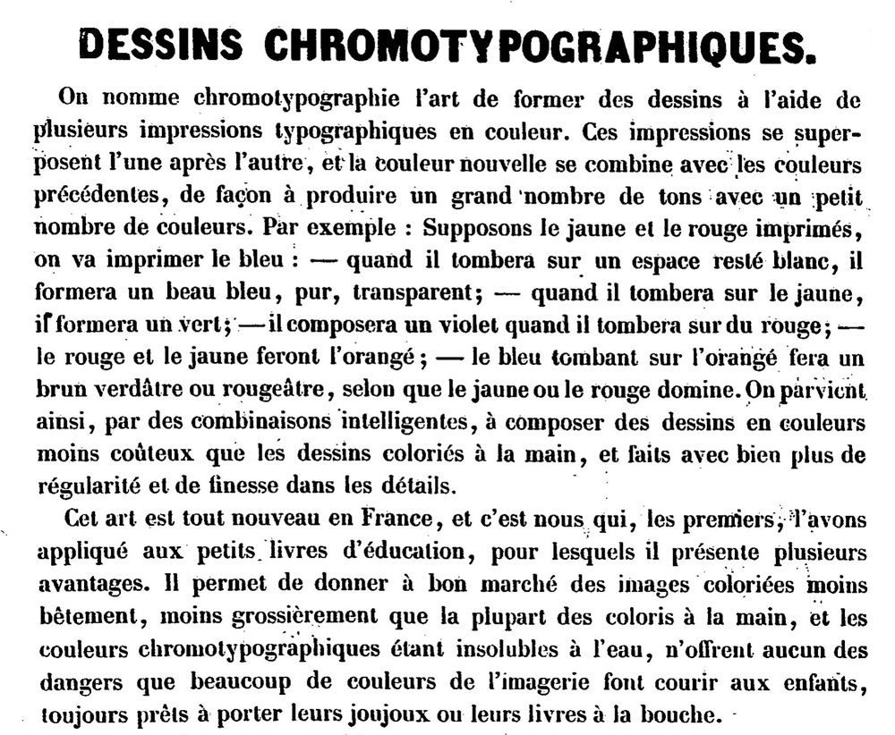 L’an dernier, à cette même époque et à cette place, je disais tout ce que m’inspirait d’estime et d’espoir l’effort de ce brave et intelligent imprimeur pour arracher à l’Allemagne le privilège des impressions en couleurs. […] La chromotypographie, qui se substitue avec tant d’avantage à la chromolithographie, exigeait des pierres coûteuses d’établissement et d’entretien, un personnel à part, des encres de premier ordre et encore mal connues, des dessinateurs qui plient leur inspiration et leur métier à ses exigences d’effet et d’économie.