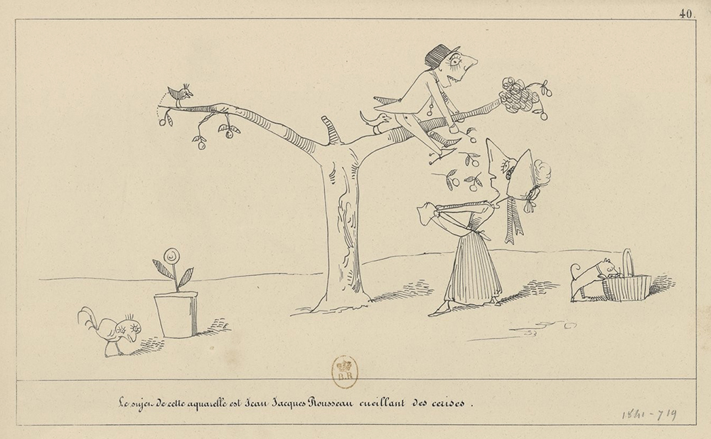 Dépassant la diversité des esthétiques, des ruptures graphiques conduisent les artistes, tout au long du XIXe siècle et encore après, à emprunter, le temps d’une case ou d’une planche, la manière d’un jeune dessinateur. Le pastiche du dessin d’enfant est comme un fil rouge dans la bande dessinée, investi suivant les époques et les personnalités de différentes colorations. Nous avons déjà dit que le griffonnage des murs, dans de multiples histoires, renvoie implicitement à la définition antique de l’album. Il évoque en même temps le « graffiti », mot que l’archéologie choisit pour définir, simultanément à la découverte des fresques de Pompéi au milieu du XIXe siècle, une inscription laissée sur un mur. Le caractère non-officiel, en marge du graffiti en fait un symbole de choix pour les satiristes dont il représente la liberté et l’impertinence. Il focalise, par un mouvement spéculaire, sur la position dévaluée de la caricature et de la séquence, il conjugue et porte à son comble, comme pour faire taire les dénigreurs de talents, graphisme désinvolte et esprit d’enfance. En arrière-plan, les graffitis se font mise en abyme du geste graphique, image assumée de la régression comique, ainsi du pendu et de la caricature du « sergen » sur les murs de la salle de police dans Le Sapeur Camember (pl. 26) ou, gravé dans la roche, du bonhomme brandissant une flèche, emblème de Philoctète dans les Aventures de Télémaque (pl. 45). Dans l’album de Cham parodiant le récit de Fénelon, deux autres cases laissent voir, accrochés au mur, une affiche et un tableau dont les dessins représentent un centaure des plus enfantins (pl. 42-43). Ils renvoient au vaste mouvement de désacralisation de l’art entamé par les nombreux Salons pour rire, Salons comiques ou Salons caricaturaux diffusés dans les journaux satiriques, auxquels sacrifie la plupart des auteurs de bandes dessinées – Cham  (55), Nadar, Gustave Doré, Stop, Bertall, Guillaume, Caran d’Ache, Christophe et Henri Hébert. Dans ces interprétations comiques des œuvres exposées, de nombreuses charges utilisent la maladresse feinte ou la déformation pour tirer la simplicité vers le simplisme ou faire régresser le sérieux vers l’enfantin  (56). Les vignettes de Cham redessinant les toiles de Manet ou de Courbet explicitent assez la démarche. Exemple cité d’album aux dessins d’enfants, Un Génie incompris fait écho à cette pratique lorsque le jeune Barnabé Gogo, « ne pouvant s’astreindre à copier » (pl. 22), reproduit sans le savoir la toile de Nicolas-Antoine Taunay (1755-1830), Le Général Junot au combat de Nazareth (1799) ou lorsque, plus âgé, il s’essaie à l’aquarelle sur le thème de Jean-Jacques Rousseau cueillant des cerises (fig. 47) – toile de Camille Roqueplan (1802-1855), Jean-Jacques Rousseau cueillant des cerises (1836).