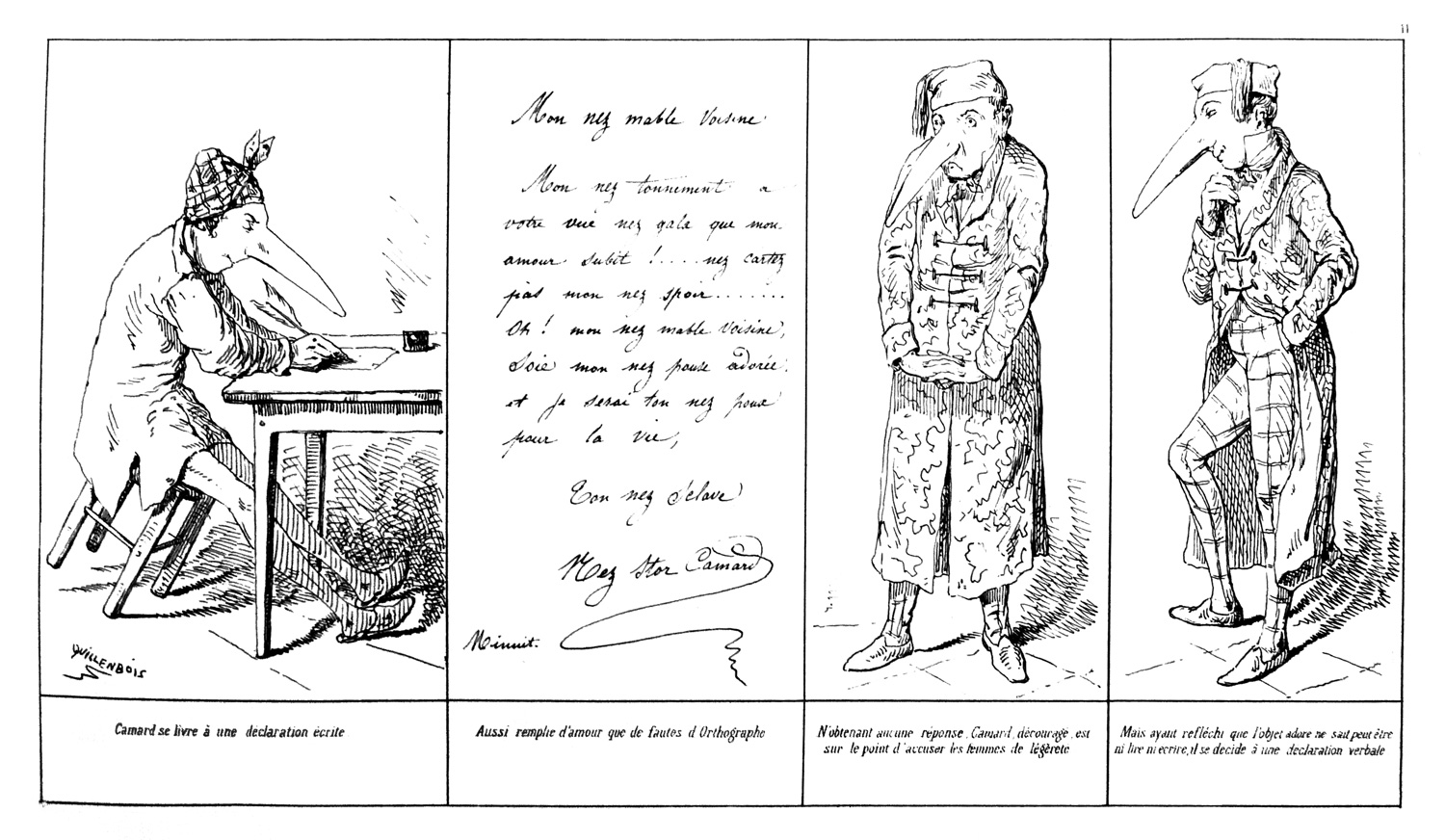 - Une case (fig. 76) donne la reproduction d’une lettre, authentifiée par l’écriture cursive, que Nestor Camard adresse à sa voisine : « Mon nez mable Voisine. Mon nez tonnement à votre vue nez gala que mon amour subit !….nez cartez pas mon nez spoir…… Oh mon nez mable voisine, soie mon nez pouse adorée, et je serai ton nez poux pour la vie, ton nez Sclave. Nez Sotr Camard. Minuit », pl. 11. Texte : « Camard se livre à une déclaration écrite. » / « Aussi remplie d’amour que de fautes d’orthographe. » / « N’obtenant aucune réponse. Camard découragé est sur le point d’accuser les femmes de légèreté. » / « Mais ayant réfléchi que l’objet adoré ne sait peut-être ni lire ni écrire, il se décide à une déclaration écrite. »[↩]