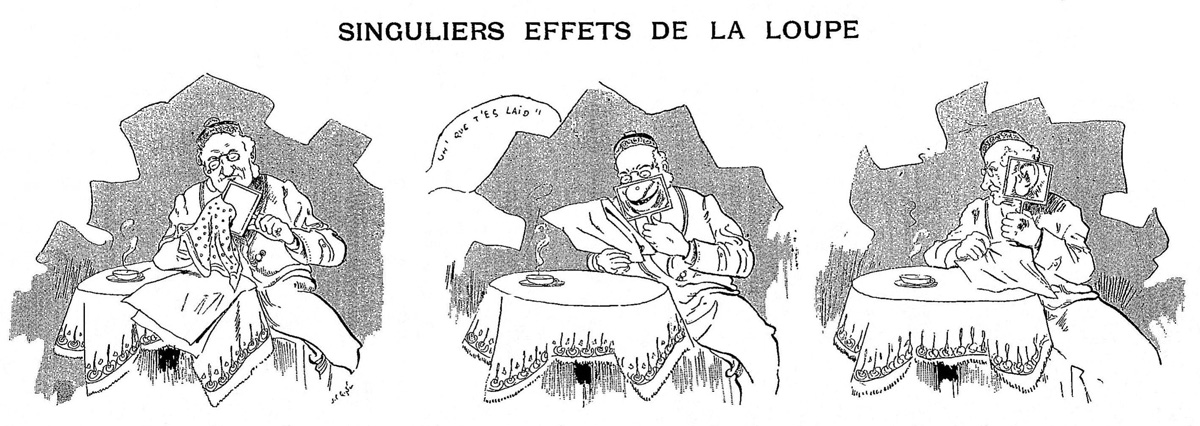 Cette authenticité fabriquée sur le régime manuscrit fait le succès, dans L’Éclipse à partir d’avril 1868, des lettres du fusilier Onésime Boquillon à sa « chaire » Simone, rapportées par Albert Humbert. Lithographiées directement sur la pierre, les graphies malhabiles d’Onésime et de Simone s’assurent les sympathies des lecteurs pour leur côté populaire (11) : fautes d’orthographe et de syntaxe enrichissent leur parler caractéristique et font l’originalité de ces lettres où texte et images s’entremêlent continûment. En 1866 déjà, dans La Lune, le feuilleton de Gédéon, La première affaire du fusilier Pilor, reproduit dans le même esprit une missive que le jeune Pilor adresse à ses « chairs parrans ». Dans Le Chèque-Obsession, histoire contenue dans le Carnet de Chèques de Caran d’Ache, L’accent germanique du Juif corrupteur se lit dans les annotations manuscrites apposées sur le talon des chèques. Dans cette séquence comme dans le reste de l’album, les lettres d’imprimerie (utilisées pour la préface, les titres, les éléments récurrents du chèque) côtoient les écritures manuelles de différentes sources (signature de Caran d’Ache au début et à la fin, commentaires du corrupteur) ainsi que des taches d’encre, des empreintes digitales, des biffures, des dessins reportés au dos des chèques. Le réalisme de l’objet est parfait, le propos bien servi par ce bric-à-brac de signes, par cet assemblage composite – comme le député soumis à la tentation du chèque partout où il va, l’œil du lecteur est appelé de toutes parts, comme saturé. La confrontation du régime manuscrit et typographique de l’écriture sert ici la satire antisémite par l’imitation d’un objet réel. Elle peut être mise au service d’un gag, comme dans une séquence de Lourdey, intitulée Petites annonces (fig. 69). Elle commence par un personnage lisant Le Journal et à côté duquel prend place le court paragraphe imitant l’annonce lue, dans sa typographie et sa disposition caractéristiques (« UNE DAME jeune encore, ayant voiture, partagerait sa fortune avec premier joli garçon qu’elle verra »).