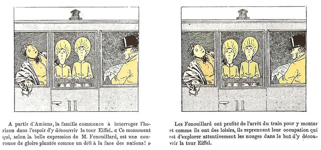 Dans les deux cases, séparées par une péripétie, la composante féminine de la famille « commence à interroger l’horizon dans l’espoir d’y découvrir la tour Eiffel » (pl. 5). Avant même que le texte ne dise l’échec (attendu) de l’entreprise dans une tierce image – « Il en résulte qu’à Paris, la famille n’a pas découvert la tour, mais a récolté un violent torticolis » (pl. 6) – la rime visuelle dit l’ennui et la platitude du voyage où ces dames ne trouvent d’autres « loisirs » que celui de reprendre « l’occupation qui est d’explorer attentivement les nuages dans le but d’y découvrir la tour Eiffel » (pl. 6). Puisqu’il n’y a pas de changement, de transformation, la séquentialité graphique paraît interrompue mais c’est pour mieux rendre l’arrêt du temps, la vaine pause contemplative qu’impose paradoxalement le déplacement en train. Le texte sous l’image, lui, ne fait que souligner ce qui est à l’œuvre dans la succession biaisée des images. Cette suspension de la narration par l’image n’en est donc pas une, la répétition exploitant plutôt un effet de citation propre au medium :