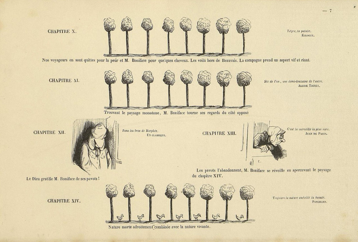 Dans les Impressions de voyage de Mr Boniface, Cham renforce effectivement le procédé lorsqu’il place, à la planche 7 (fig. 83), trois images quasi identiques sur la même planche et casse par leur dimension (des images-bandeaux), par leur disposition (l’une en dessous de l’autre, mimant le plan tristement horizontal du chemin balisé) et par leur contenu (un alignement d’arbres sommaires) la relative homogénéité de l’album. Le voyageur traverse en diligence une campagne qui prend ironiquement, hors de Beauvais, « un aspect vif et riant ». « Trouvant le paysage monotone, M. Boniface tourne ses regards du côté opposé » mais l’horizon reste le même. À la case suivante le personnage s’endort, et à celle d’après, il « se réveille en apercevant le paysage du chapitre XIV », renvoi mettant précisément l’accent sur l’élaboration de l’œuvre, la composante graphique étant interrogée dans ses propres codes figuratifs lorsque la dernière image s’efforce de « faire tableau » à partir de la triste vue : « Nature morte adroitement combinée avec la nature vivante », sur cette citation « Toujours la nature embellit la beauté », vers baudelairien attribué à « Ponchard » ! Distribution (16) et répétition des images, jusqu’à la gradation de la parodie picturale et romantique, accompagnent ainsi l’écriture graphique dans la notation de l’uniformité du paysage observé en voyage. Dans cet album d’Impressions de voyage, Cham emploie ainsi, pour caricaturer ce que donne à voir le déplacement moderne, les ressources du montage comme de l’image unique, lesquelles prennent sens dans la confrontation au reste des cases.