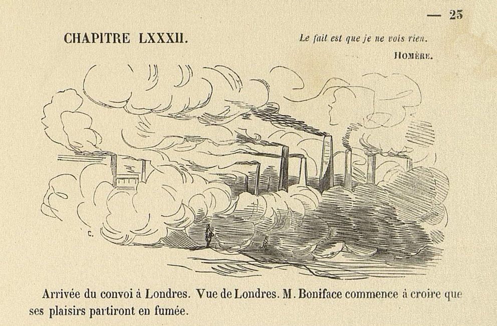 Ailleurs, le schématisme symbolique lui permet d’accuser la vitesse du train lancé sur le « grand chemin de fer de Folkon » – la campagne semblant « courir devant lui à raison de 40 lieues à l’heure » se concrétise en une maison et des arbres flanqués de jambes, dont le dessin se perd en gribouillis (17) (pl. 22 et pl. 23) –, le dessin rudimentaire de mimer la pauvreté d’« un point de vue nautique » (pl. 16), le gros plan subjectif – « Ce qui contrarie horriblement notre voyageur, c’est de voir entrer les souliers du postillon dans la composition des paysages qui se déroulent à sa vue » (pl. 8) – et la paralipse graphique de signifier l’obstruction du champ de vision – la « Vue de Londres » (pl. 23, fig. 84) est empêchée par un écran de fumée. Ces procédés, confrontant la fixité du voyageur-spectateur au déroulement orienté et irréversible du paysage, sont les équivalents graphiques (et comiques) des nouvelles catégories descriptives en littérature, où le flou, le brouillé, l’effacement, le « défilé » sont rendus par les plumes de Paul Verlaine (La Bonne Chanson, « Le paysage dans le cadre des portières, / Court furieusement »), de Théophile Gautier (Fusains et Eaux-fortes, « Les arbres fuyaient à droite à gauche comme une armée en déroute »), de Victor Hugo (lettre IV évoquant son voyage en Belgique, en 1837, « La rapidité est inouïe. Les fleurs au bord du chemin ne sont plus des fleurs, ce sont des taches […] les villes, les clochers et les arbres dansent et se mêlent follement à l’horizon ») puis d’Émile Zola, dont le roman du train, La Bête humaine (1890), contient une scène de défilement digne d’un effet de pré-cinéma (18). La peinture impressionniste rend également compte de ces nouveaux regards confrontés à une modernité symbolisée, pour Claude Monet, par l’intérieur de La Gare Saint-Lazare (1877). Aussi, comment ne pas penser, devant la case où Mr Boniface observe Londres embrumée (fig. 84), aux toiles du britannique William Turner (1775-1851), telle Pluie, vapeur et vitesse – The Great Western Railway (peinte en 1844, année de publication de l’album de Cham (19)).