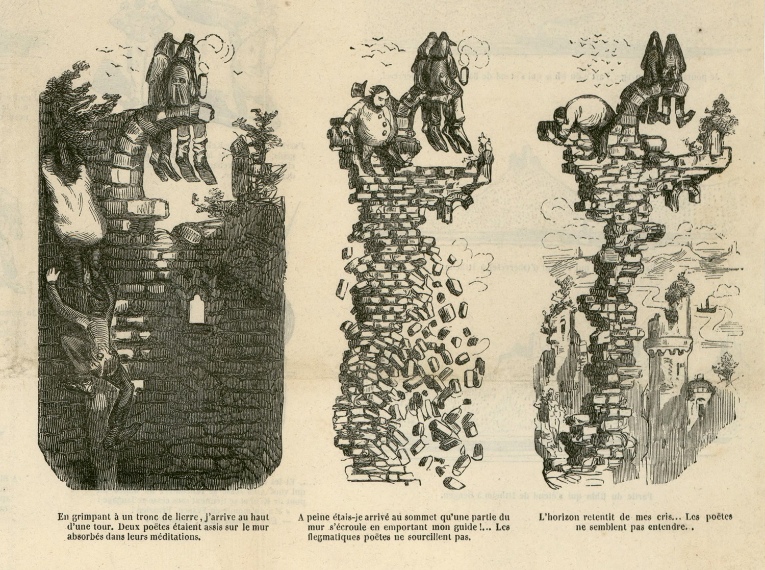 Transparaît, dans cette représentation des sites visités, une satire de la théorie esthétique du pittoresque notamment définie par William Gilpin comme « that kind of beauty which is agreeable in a picture », dans An Essay upon Prints (1768) (22). Déjà présente dans The Tour of Doctor Syntax in Search of the Picturesque (23), l’imitation parodique du style pittoresque se remarque particulièrement dans le Voyage en Allemagne (Le Journal pour rire, 1851) où Gustave Doré se plaît au dessin, selon des perspectives plus qu’aléatoires, de l’habitat allemand. Les principes du pittoresque selon Gilpin, comme l’irrégularité ou « the roughness » (la rudesse, l’accidenté), sont ici poussés à l’extrême. L’épisode de la visite des ruines dominant le village – où un couple de poètes, en pleine méditation sur le haut d’une tour, est bientôt recouvert par la faune et la flore tandis que l’édifice s’effondre progressivement, fig. 85 – parodie les théories d’Uvedale Price (An Essay on the Picturesque, 1796), inspirées de Gilpin, qui voient dans la ruine, la carrière ou tout terrain dévasté et marqué par l’écoulement du temps et les progrès de la végétation le modèle du motif pittoresque (24).