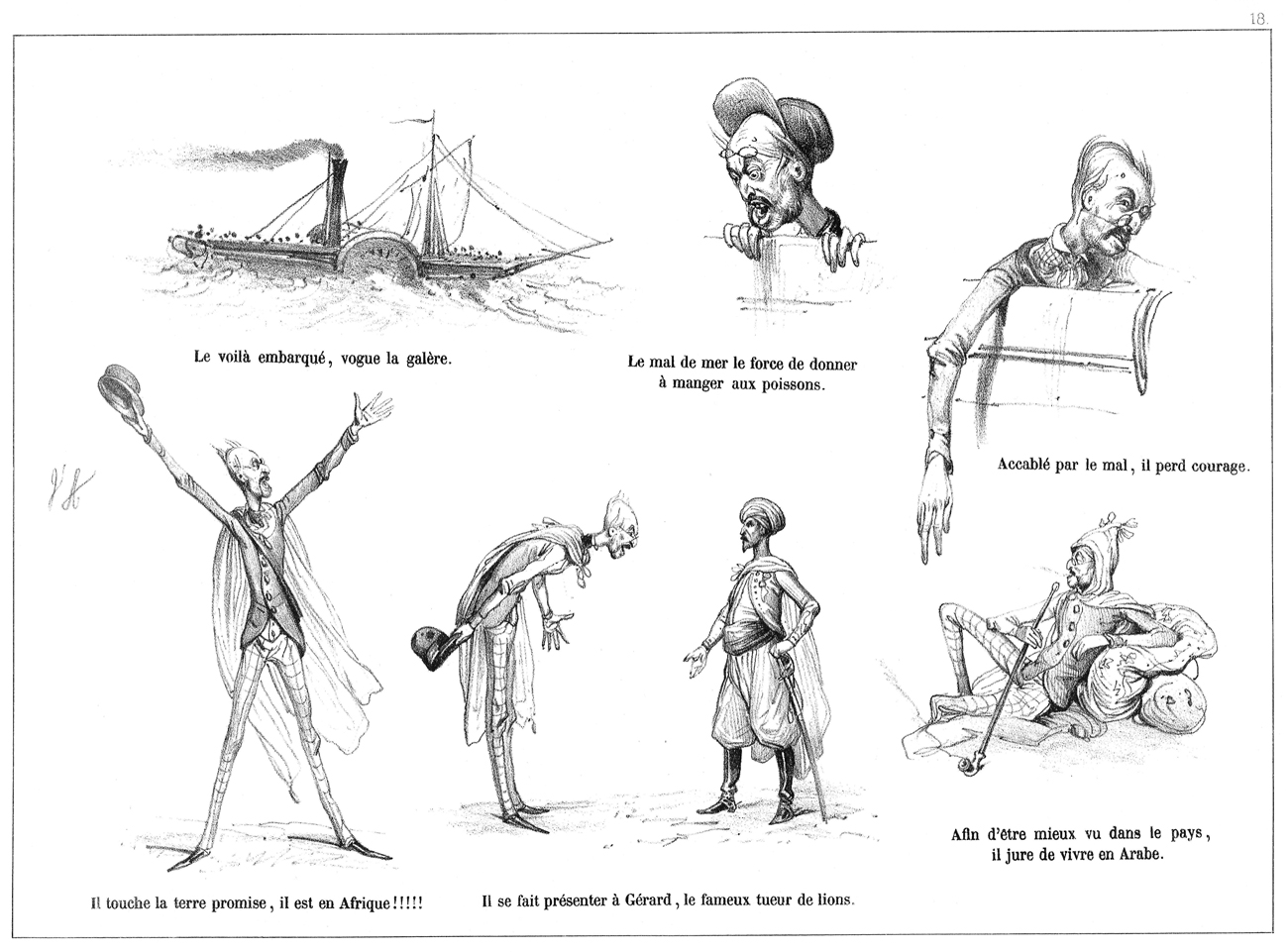 Aventures prodigieuses de Tartarin de Tarascon, ce récit d’aventures burlesques qu’Alphonse Daudet (1840-1897) publie en 1872 chez Dentu (45), pourrait avoir comme sources d’inspiration trois bandes dessinées. Les deux premières sont les feuilletons réalisés par Benjamin Roubaud (Les Aventures de Scipion l’Africain, L’Illustration, 1845) et par Monta (La Caravane de M. Bibloteau en Afrique, Le Journal pour rire, 1849). Une même image d’un Orient de fantaisie sert de cadre à ces personnages qui y vivent des aventures prodigieuses, au point que Dominique Bernasconi évoque une filiation :