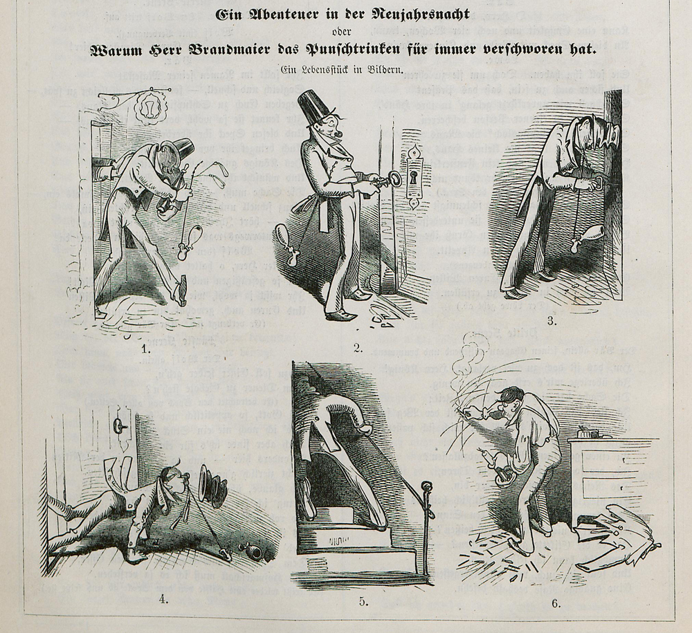 Pour une histoire en images du XIXe siècle, la représentation de l’ivresse donnée par Daisne dans Le Pêle-Mêle est plutôt inhabituelle. En général, l’homme saoul y est présenté comme un personnage comique à ses dépens, provoquant accidents et autres catastrophes. Wilhelm Bush est probablement celui qui traita le mieux ce sujet. Trois histoires parues entre 1863 et 1868 dans le Fliegende Blätter montrent les effets de l’abus d’alcool sur un personnage rentrant chez lui après une soirée arrosée :