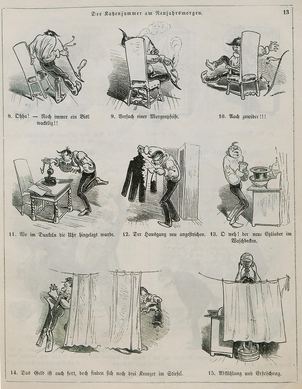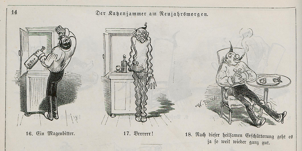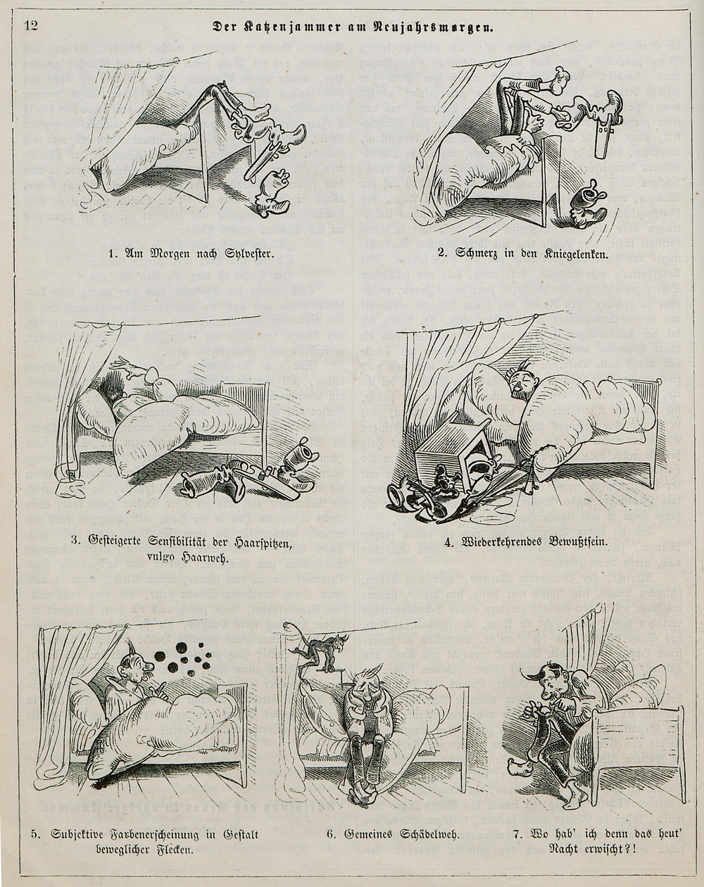 Wilhelm Bush, « Der Katzenjammer am Nenjahrsmorgen », Fliegende Blätter, n° 1174, 1868. Source : Heidelberg University Library.