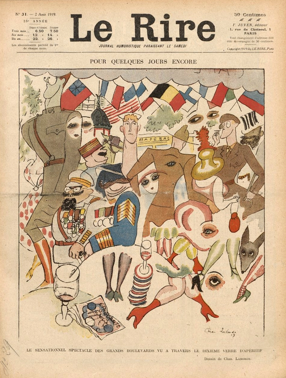 Chas Laborde, « Pour quelques jours encore. Le sensationnel spectacle des Grands Boulevards vu à travers le dixième verre d’apéritif », Le Rire, 2 août 1919. Source : Gallica.bnf.fr