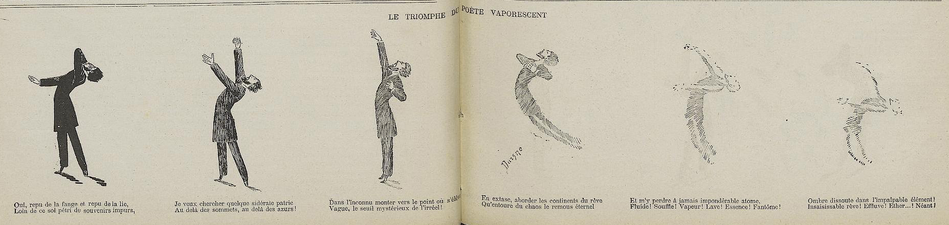 « Le triomphe du poète vaporescent » est une courte séquence de six images qui s’étend sur la double page centrale du Rire n° 19 du 16 mars 1895, en partie basse (sous de magnifiques dessins de Valloton illustrant un texte de Jules Renard).