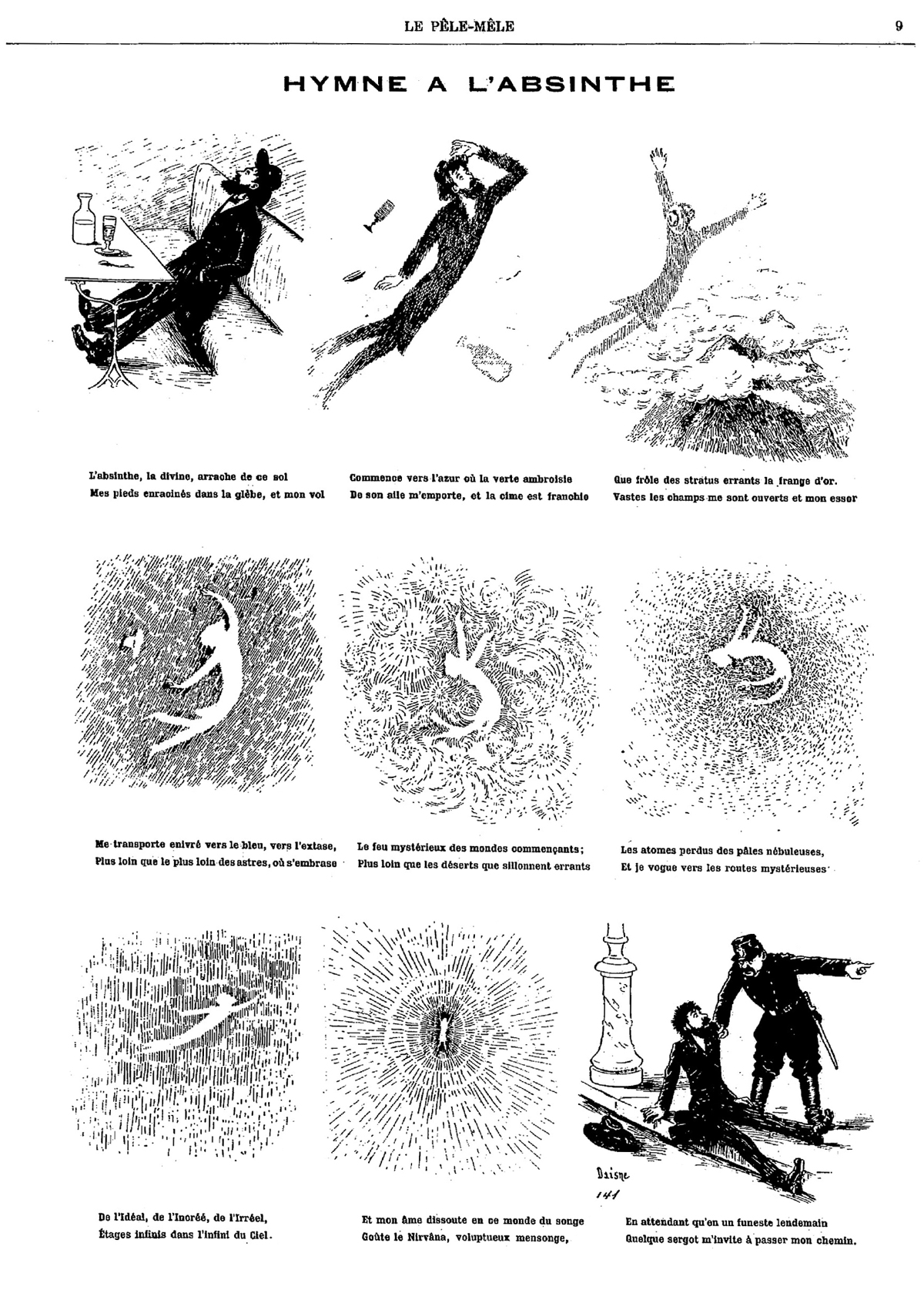 L’« Hymne à l’absinthe », histoire en images par Daisne publiée dans la revue Le Pêle-Mêle du 28 novembre 1897, rappellerait presque un épisode du comic strip. Au lieu d’une aventure onirique, elle décrit l’expérience hallucinatoire d’un buveur d’absinthe. Sous l’effet de la fée verte, le personnage décolle du sol, s’envole pour planer au-dessus de sommets montagneux. Son voyage se transforme ensuite en une sorte d’expérience extatique, avant de finir par un réveil brutal sur le bitume d’un trottoir, comme Nemo tomberait de son lit.