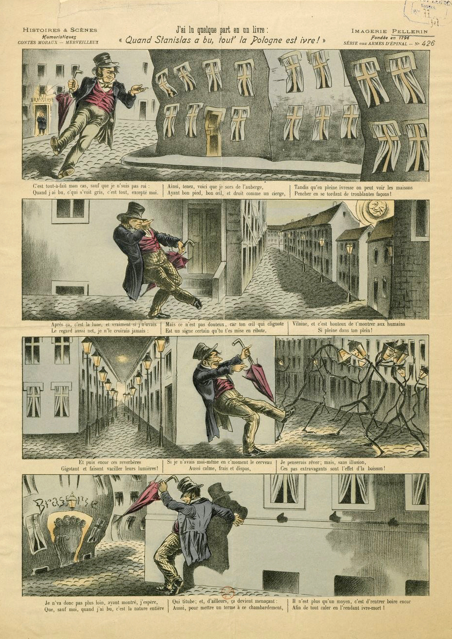 Ces mêmes effets visuels déformant se retrouvent au début du XXe siècle, dans une planche anonyme publiée par l’imagerie Pellerin d’Epinal, « Quand Stanislas a bu, tout’ la Pologne est ivre ! » (Série aux armes d’Epinal, n° 426, 1907) :