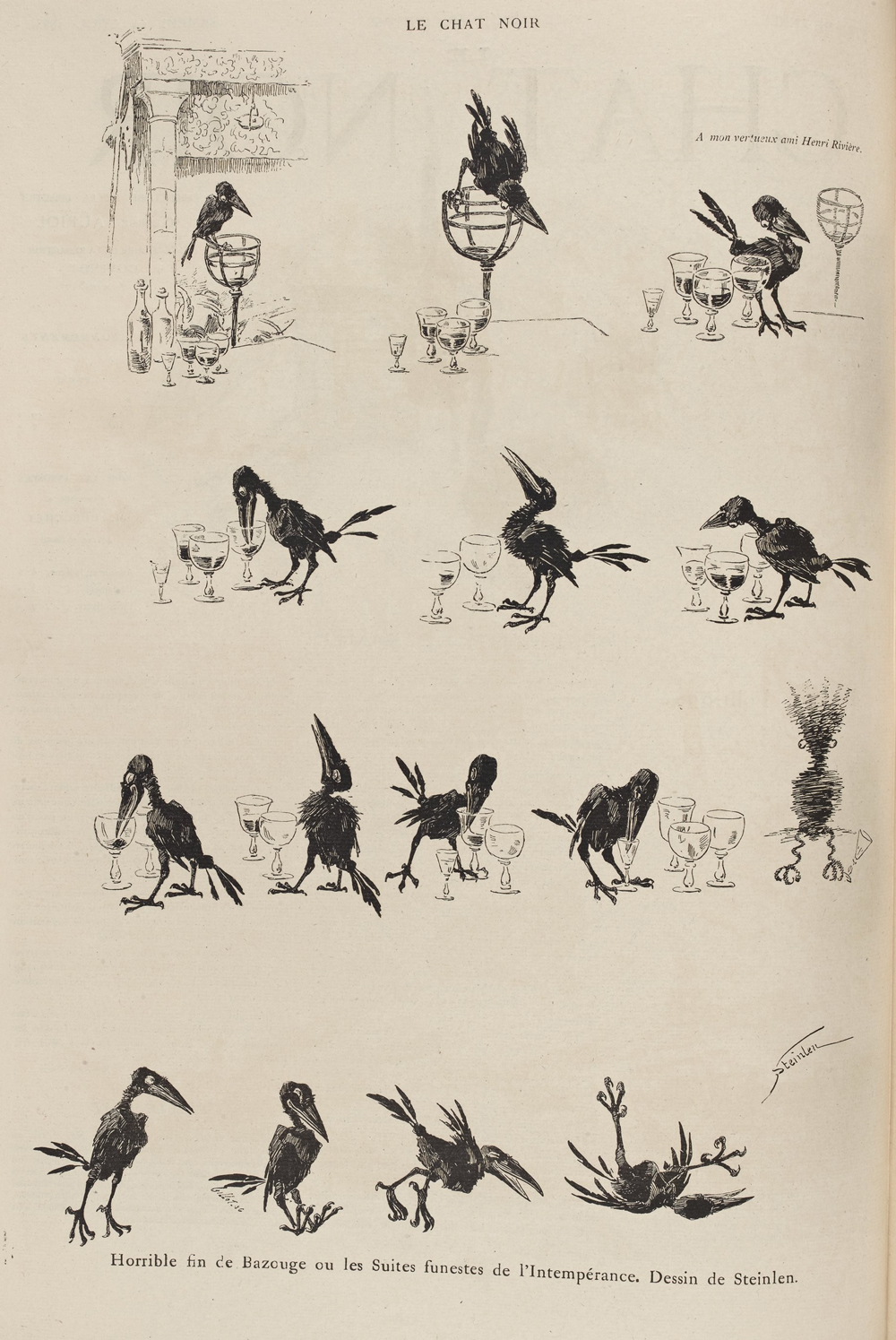 Largement influencé à ses débuts par le maître d’Outre-Rhin, Théophile-Alexandre Steinlen avait repris à Busch plusieurs motifs pour imaginer ses premières bandes dessinées. Ainsi dans sa planche sans légendes « Horrible fin de Bazouge», parue dans Le Chat Noir du 11 avril 1885, le corbeau ivre est tout droit inspiré de celui du livre de Wilhelm Busch, Hans Huckebein (1867-1868). Le dessinateur montmartrois raconte comment le volatile trop curieux périt par l’alcool. Après avoir bu dans un verre abandonné, son corps est secoué par des spasmes violents qui lui sont fatals (1).