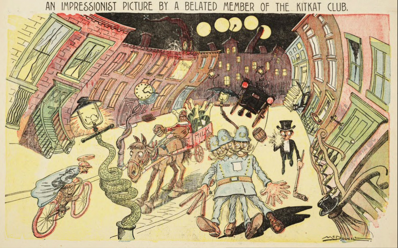 Mise à jour du 21 février 2019 : Nous ajoutons deux intéressantes images de déformations dûes à l’excès d’alcool. La première est de l’américain Walter McDougall, « An Impressionist Picture By A Belated Member Of The Kitkat Club Public », qui fut publiée dans New York Journal du 20 mars 1898.
