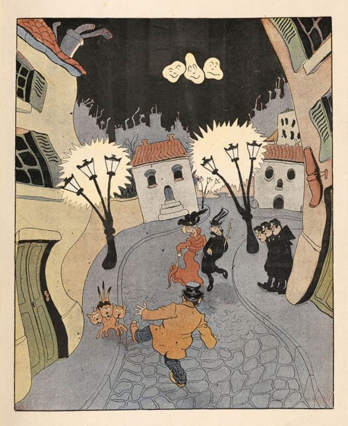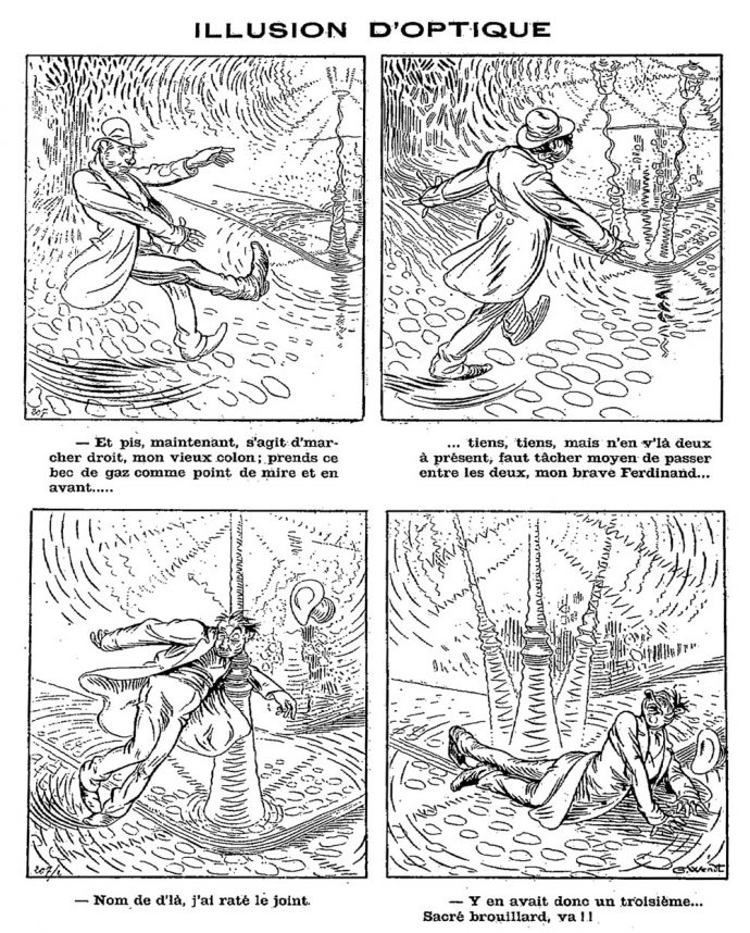 Mise à jour du 21 avril 2024 : La multiplication du réverbère sous les effets de l’alcool est également le thème d’une histoire en images parue dans Le Pêle-Mêle en 1897 et dessiné par Gustave Wendt.
