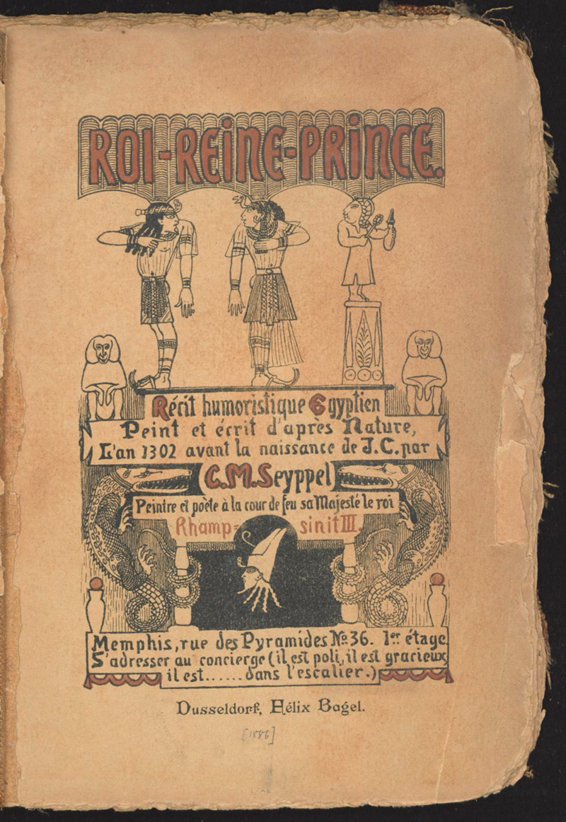 Titre et sous-titre : Roi-Reine-Prince. Récit humoristique égyptien, peint et écrit d’après nature, l’an 1302 avant la naissance de J.-C., par C. M. Seyppel, peintre et poète à la cour de feu S. M. le roi Rhampsinit II