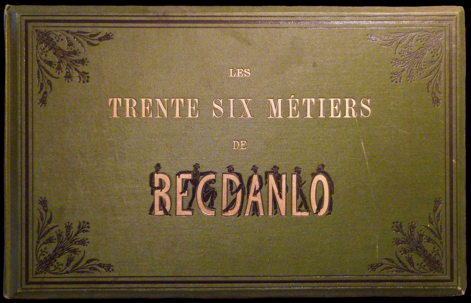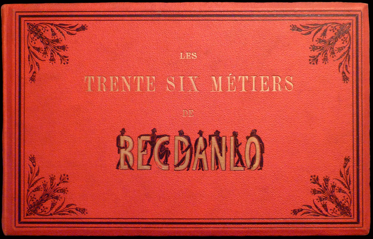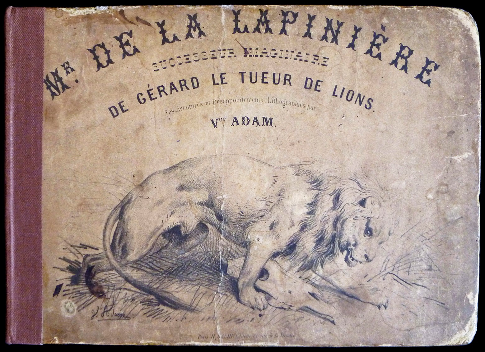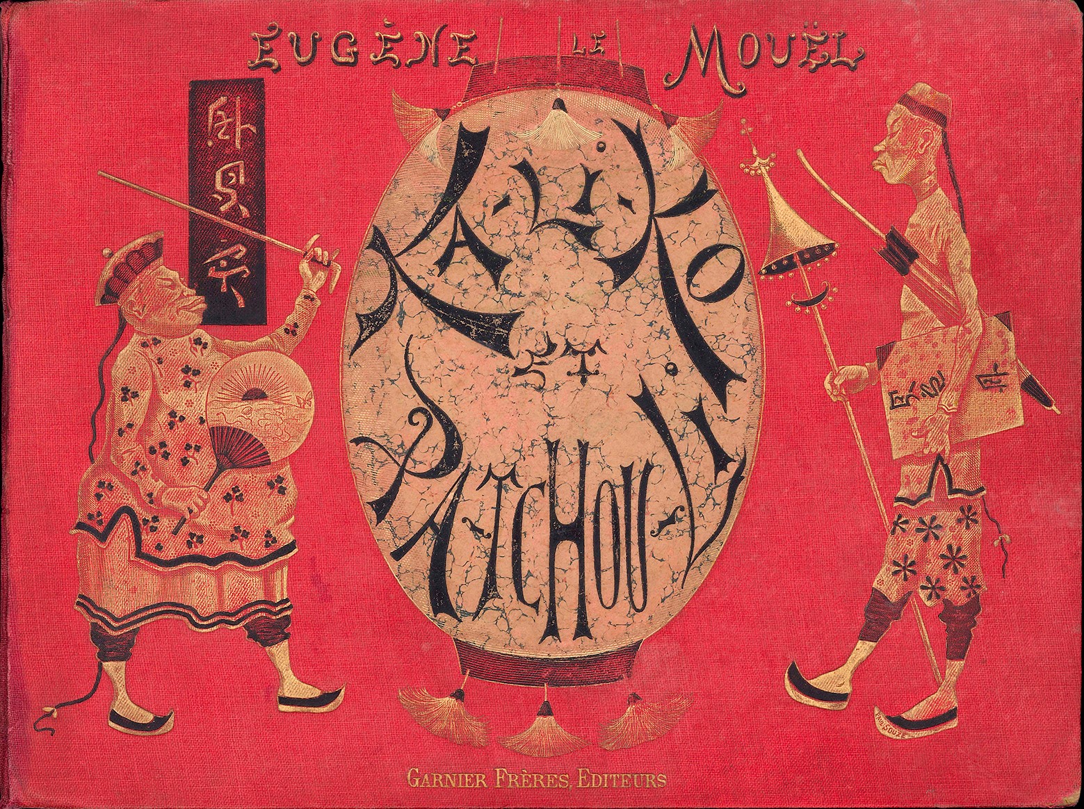 – In-4° oblong, cartonnage pleine toile rouge, fers spéciaux, titres et filets à l’or, illustration or et polychrome de l’auteur, plats biseautés et tranches dorées. Armes de l’éditeur en noir sur le plat inférieur