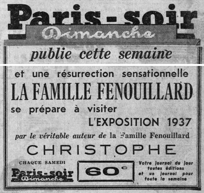 Un mois après le retour du sapeur, le quotidien Paris-Soir annonce une « résurrection sensationnelle » dans son supplément dominical : « La famille Fenouillard se prépare à visiter l’Exposition de 1937, par le véritable auteur de La famille Fenouillard, Christophe » (9).