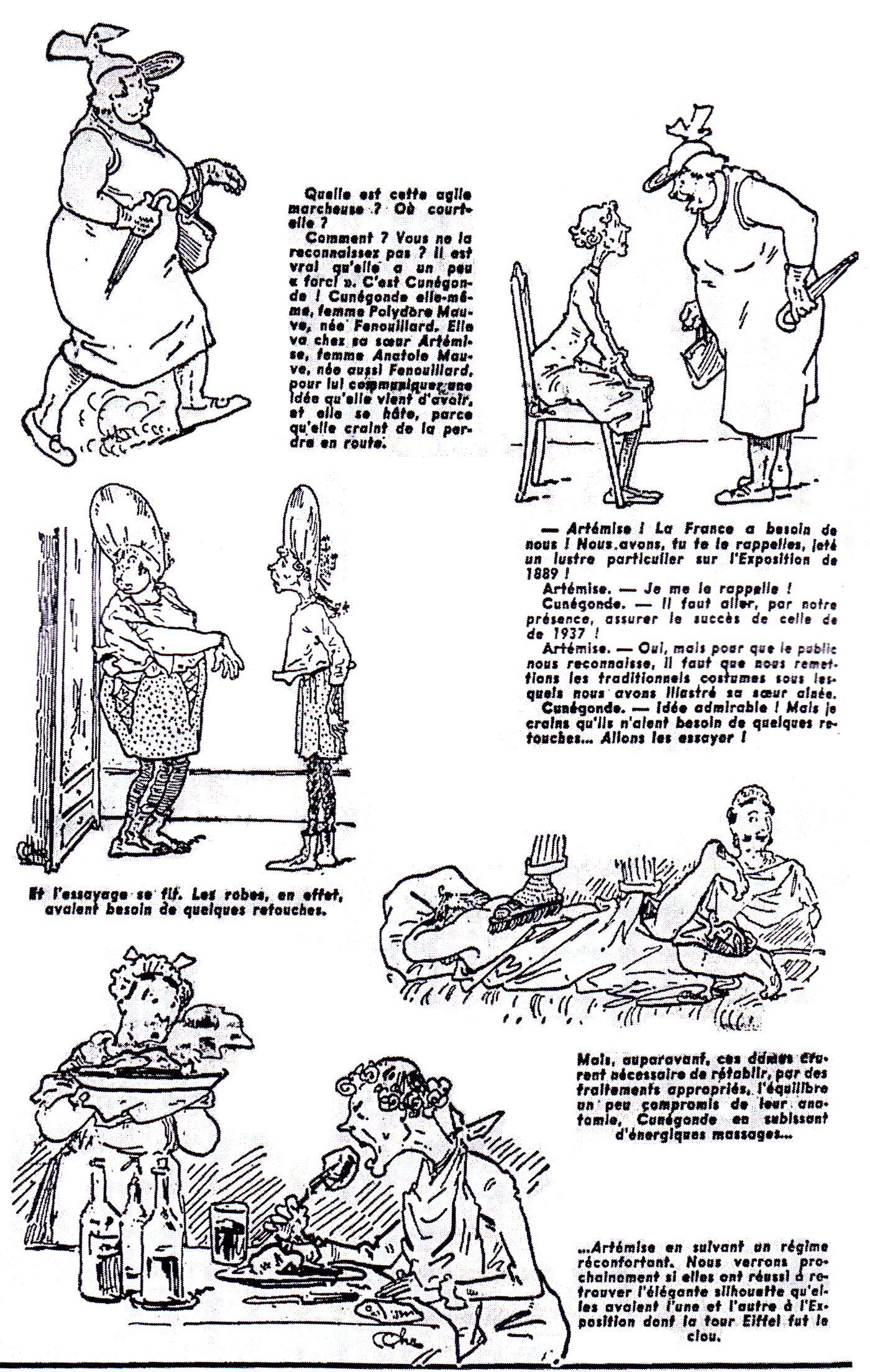 Apprenant la nouvelle de la tenue de cette nouvelle Exposition parisienne, elles décident de s’y rendre, persuadées que leur présence assurera le succès de cette manifestation, comme elles avaient « jeté un lustre particulier » sur celle de 1889. Mais avant, elles se lancent chacune dans un régime, l’une pour maigrir, l’autre pour grossir, afin de retrouver la silhouette de leur jeunesse et ainsi de pouvoir rentrer dans leur costume d’époque (12).