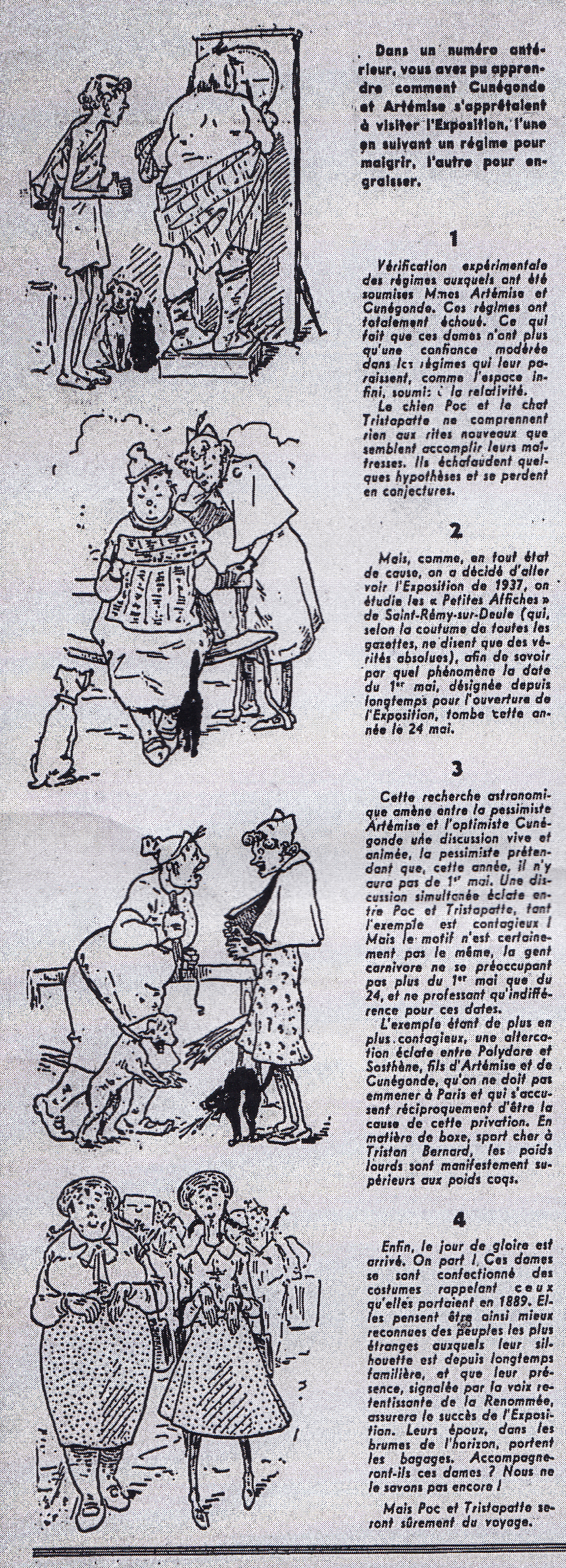 L’édition de Paris-Soir-Dimanche du 29 mai propose un deuxième épisode intitulé « Derniers préparatifs d’Artémise et Cunégonde ». On y apprend que les régimes furent inefficaces. Une dispute éclate entre les sœurs à propos de la date d’ouverture de l’Exposition. Elle s’étend à leurs animaux de compagnie (le chien Poc et le chat Tristapatte) et à leurs fils (Polydore et Sosthène) (13). Rabibochées, le lecteur quitte les deux femmes sur le chemin du départ, avec les nouveaux costumes qu’elles se sont confectionnés et qui rappelle l’ancien, pensant qu’ainsi elles pourront « être mieux reconnues des peuples les plus étranges auxquels leur silhouette est depuis longtemps familière ».