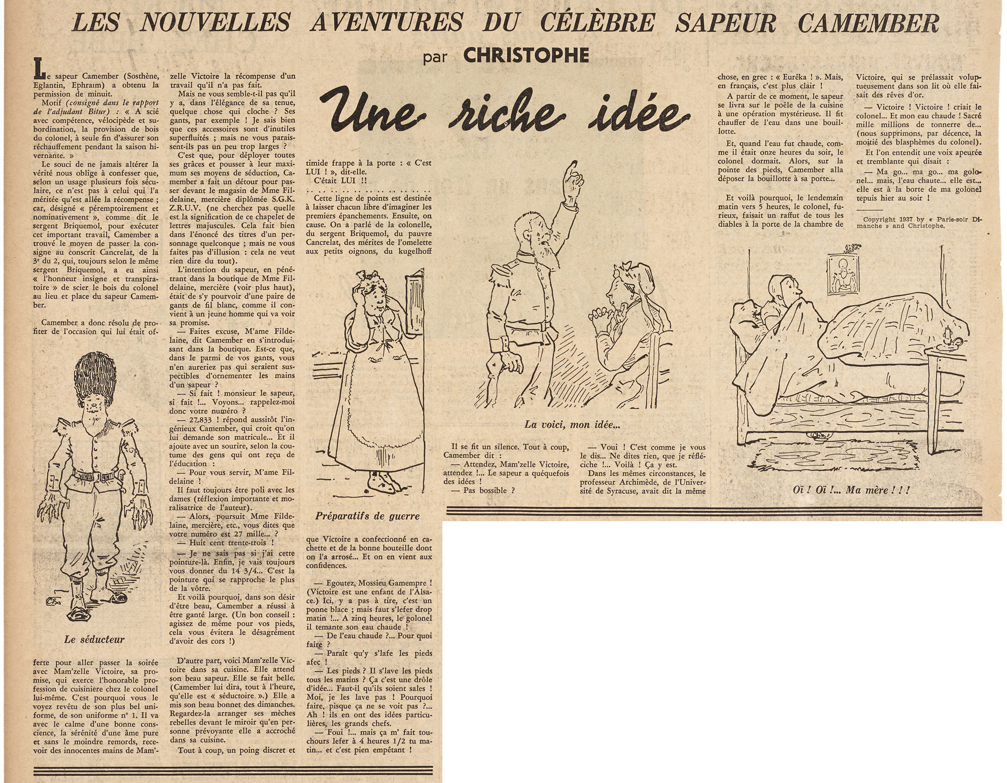 Dans cette même rubrique du Paris-Soir Dimanche, Christophe pubie le 17 janvier 1937 les « nouvelles aventures du célèbre sapeur Camember ». Le facétieux militaire au bonnet de poils reprend du service dans un épisode intitulé « Une riche idée ». Il ne s’agit pas d’une histoire en images comme celles parues dans Le Petit Français illustrée entre 1890 et 1896, mais d’un texte illustré de quatre dessins.