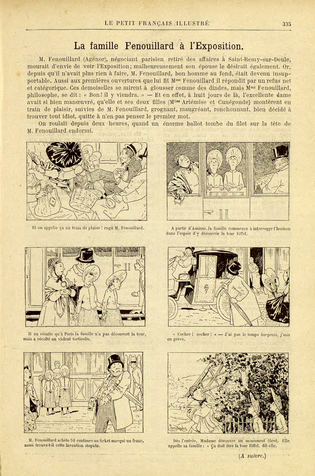 Il s’agit d’un retour aux sources puisque les aventures de la famille Fenouillard débutèrent en 1889 lorsqu’Armand Colin, qui venait de fonder Le Petit Français illustré, demanda à Christophe de dessiner l’histoire d’une famille visitant l’Exposition universelle qui se tenait cette année à Paris. Cette première aventure intitulée « La famille Fenouillard à l’Exposition » parut du 31 août au 28 septembre 1889. Elle ne fut pas reprise dans l’album publié en 1893, l’actualité de la manifestation qui s’était tenue quatre ans auparavant étant passée (10).