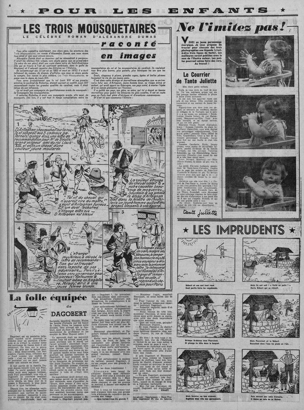 Au programme de cette page figurent des contes et des histoires illustrées par des dessinateurs comme Jean de Brunhoff, André Hellé, Jacques Nam ou Jean Effel, des jeux, un courrier des lecteurs, et des bandes dessinées en feuilletons. A l’époque où Christophe y collabore (1936-1937), on peut y lire « Mali, l’hippopotame » dessiné par Pellos sur des textes d’Henry Clérisse, « Les Trois mousquetaires » de René Giffey, « Le dernier des Mohicans » de Savile Lumley, « Les Mésaventures de Bébert » (Rupert Bear en version originale) de l’anglaise Mary Tourtel, ou encore « Heidi », une adaptation d’un film (en photogrammes légendés) avec la jeune Shirley Temple en vedette. Le format de ces bandes dessinées, présentant des dessins avec des lignes de textes en-dessous, est le même que les histoires en images de Christophe de la Belle Epoque, et qui s’imposera définitivement au tout début du XXe siècle dans la presse enfantine française (20). Dans d’autres séries, les dialogues se font dans des bulles, comme « Les exploits de Jacquou » de Giffey ou « Fred l’intrepide » (traduction de Tim Tyler’s Luck) de l’américain Lyman Young, strip distribué par Opera Mundi.