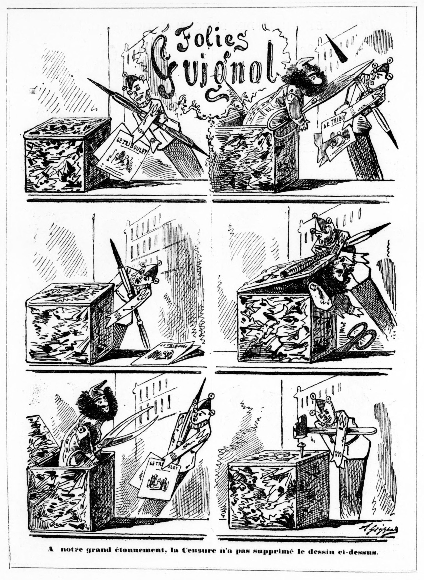 Jusqu’à la loi du 29 juillet 1881 sur la liberté de la presse, toute image destinée à être publiée ou diffusée devait obtenir une autorisation préalable. Les dessinateurs avaient l’obligation de présenter leurs dessins à un bureau de censure avant de pouvoir les publier. Quand des dessins ne sont pas autorisés à paraître, certains journaux se plaignent ouvertement des décisions de ce régime liberticide. Pour manifester leur mécontentement, ils insèrent à la place la description écrite des dessins interdits ou les remplacent par des vignettes vides avec l’indication « dessin supprimé par la censure ».