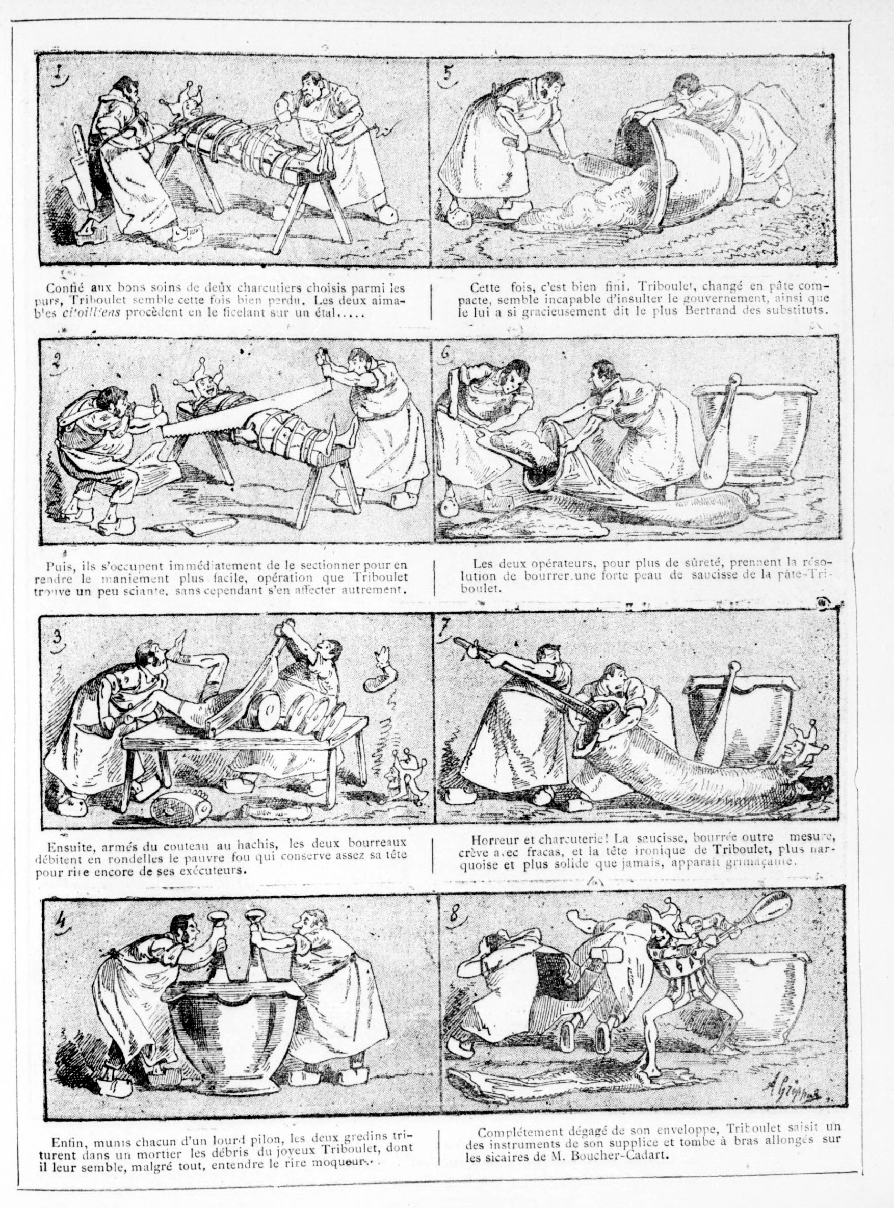 Si Le Triboulet a quand même publié cette histoire sans ses images, il en explique la raison : « Les légendes que nous maintenons à la page ci-contre expliquent suffisamment ce que chaque croquis représentait. (6). » Effectivement, cette bande dessinée censurée semble plus proche du modèle des images d’Epinal, dans lesquelles généralement le dessin est plus illustratif que narratif, que de la « littérature en estampes » de Rodolphe Töpffer dans laquelle « Les dessins, sans le texte, n’auraient qu’une signification obscure ; le texte, sans les dessins, ne signifierait rien »  (7).