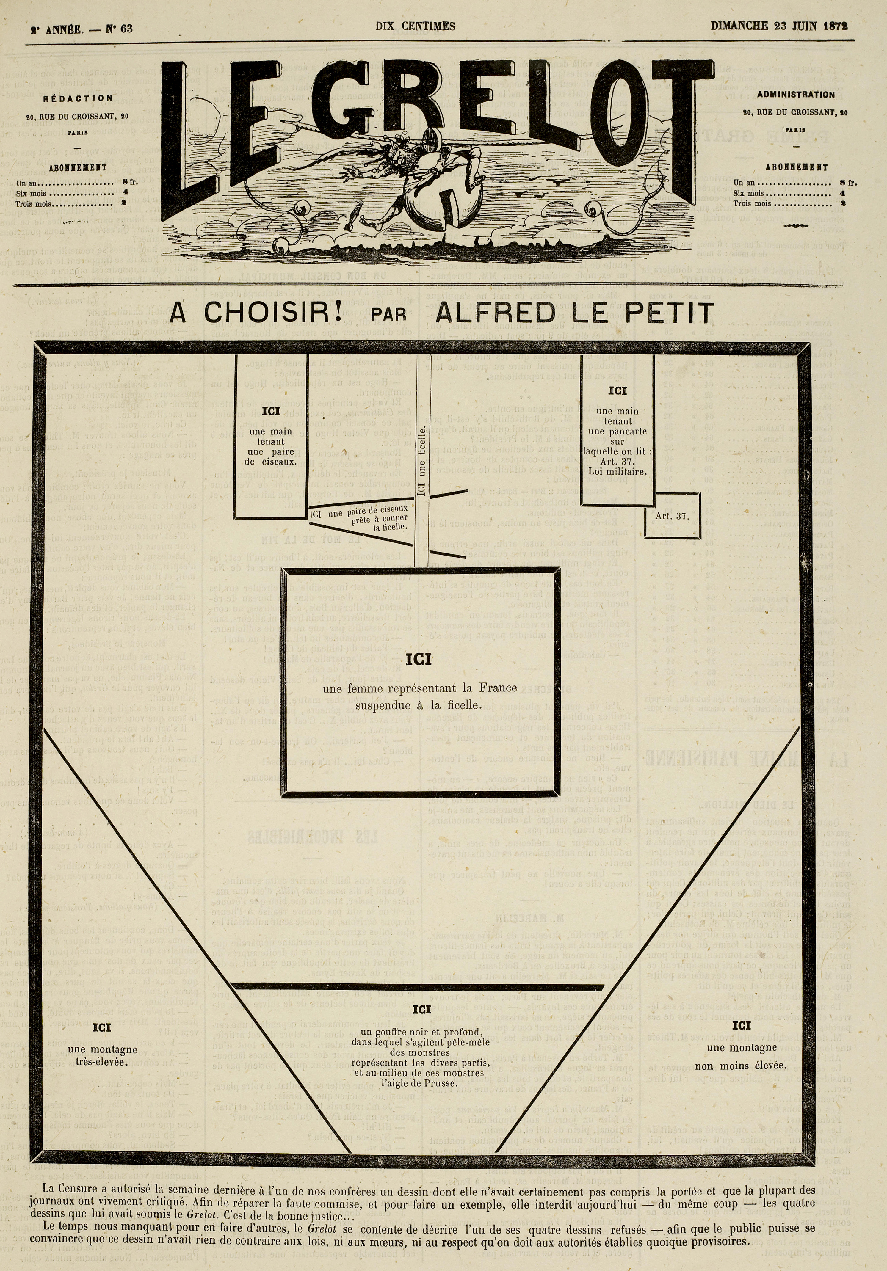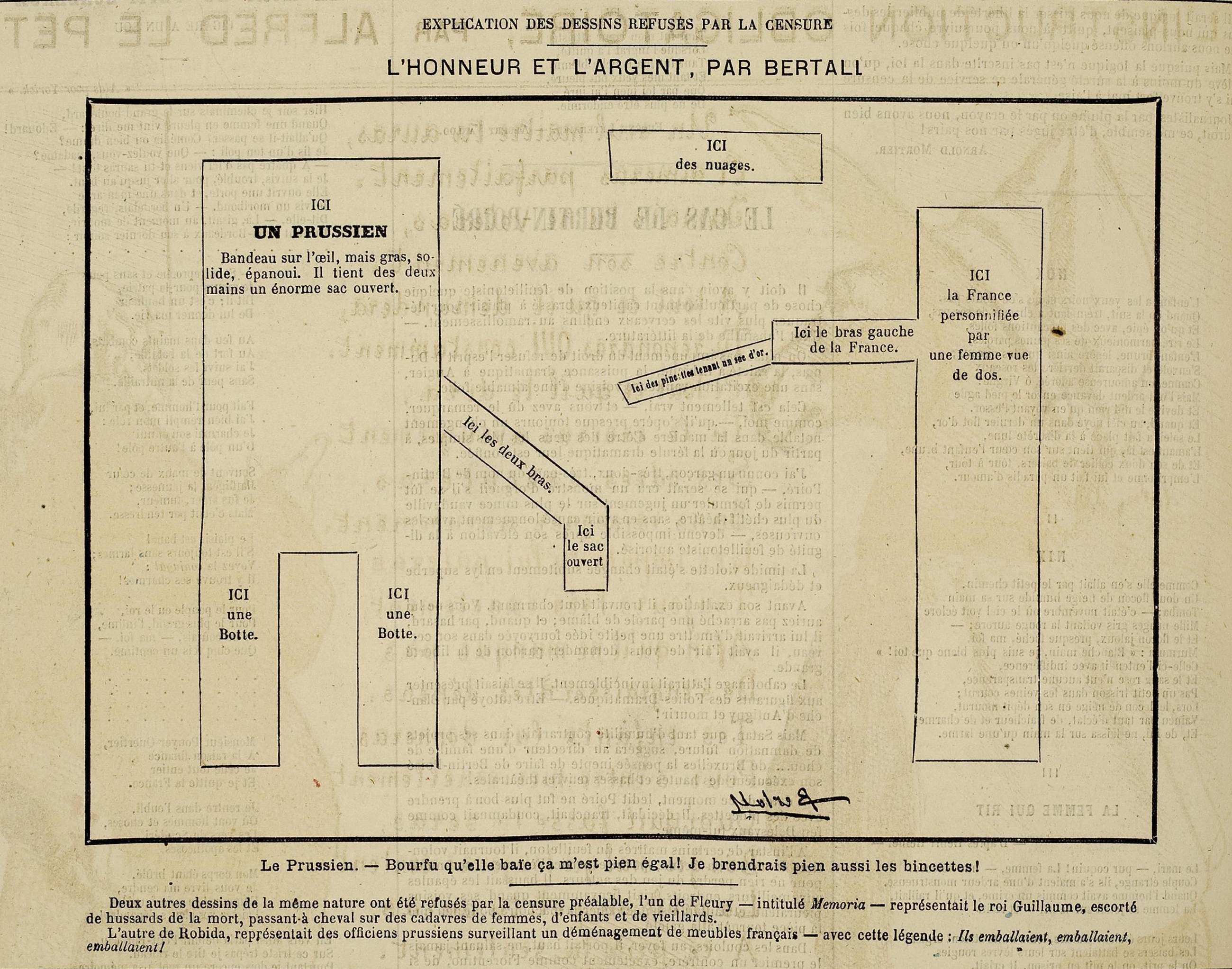 Quelques années avant les interdictions du Triboulet, Le Grelot, un autre journal satirique illustré, choisit de maintenir, à l’emplacement où ils devaient figurer, une description de dessins anti-prussiens interdits par la censure. Cependant, il ne s’agit pas de la simple description textuelle des caricatures non autorisées : la composition initiale est suggérée par l’indication écrite des principaux éléments de la scène qui sont placés dans des formes géométriques rudimentaires.